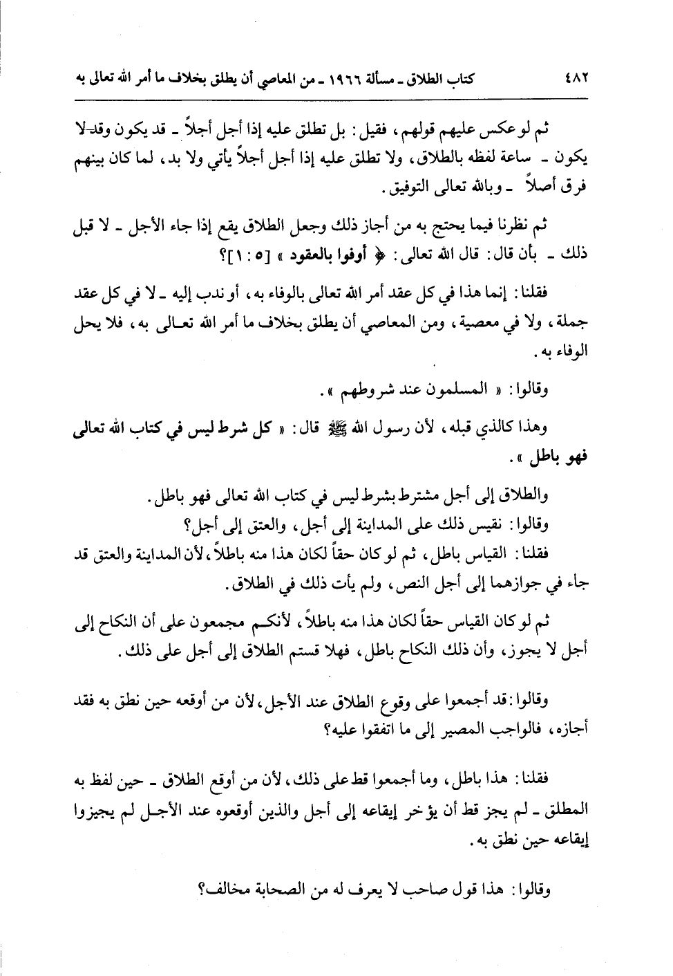 ثُمَّ نَظَرْنَا فِيمَا يَحْتَجُّ بِهِ مَنْ أَجَازَ ذَلِكَ وَجَعَلَ الطَّلَاقَ يَقَعُ إذَا جَاءَ الْأَجَلُ - لَا قَبْلَ ذَلِكَ - بِأَنْ قَالَ: قَالَ اللَّهُ تَعَالَى: {أَوْفُوا بِالْعُقُودِ} [المائدة: 1] ؟ فَقُلْنَا: إنَّمَا هَذَا فِي كُلِّ عَقْدٍ أَمَرَ اللَّهُ تَعَالَى بِالْوَفَاءِ بِهِ، أَوْ نَدَبَ إلَيْهِ - لَا فِي كُلِّ عَقْدٍ جُمْلَةً، وَلَا فِي مَعْصِيَةٍ، وَمِنْ الْمَعَاصِي أَنْ يُطَلِّقَ بِخِلَافِ مَا أَمَرَ اللَّهُ تَعَالَى بِهِ، فَلَا يَحِلُّ الْوَفَاءُ بِهِ.