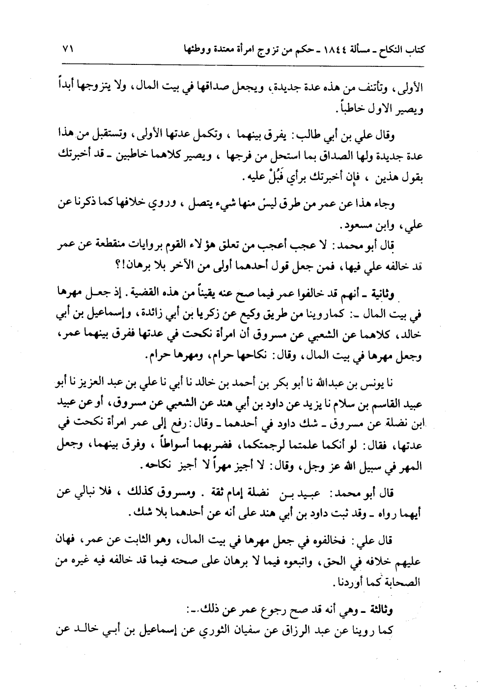 قَالَ عَلِيٌّ: فَخَالَفُوهُ فِي جَعْلِ مَهْرِهَا فِي بَيْتِ الْمَالِ، وَهُوَ الثَّابِتُ عَنْ عُمَرَ، فَهَانَ عَلَيْهِمْ خِلَافُهُ فِي الْحَقِّ، وَاتَّبَعُوهُ فِيمَا لَا بُرْهَانَ عَلَى صِحَّتِهِ فِيمَا قَدْ خَالَفَهُ فِيهِ غَيْرُهُ مِنْ الصَّحَابَةِ كَمَا أَوْرَدْنَا.