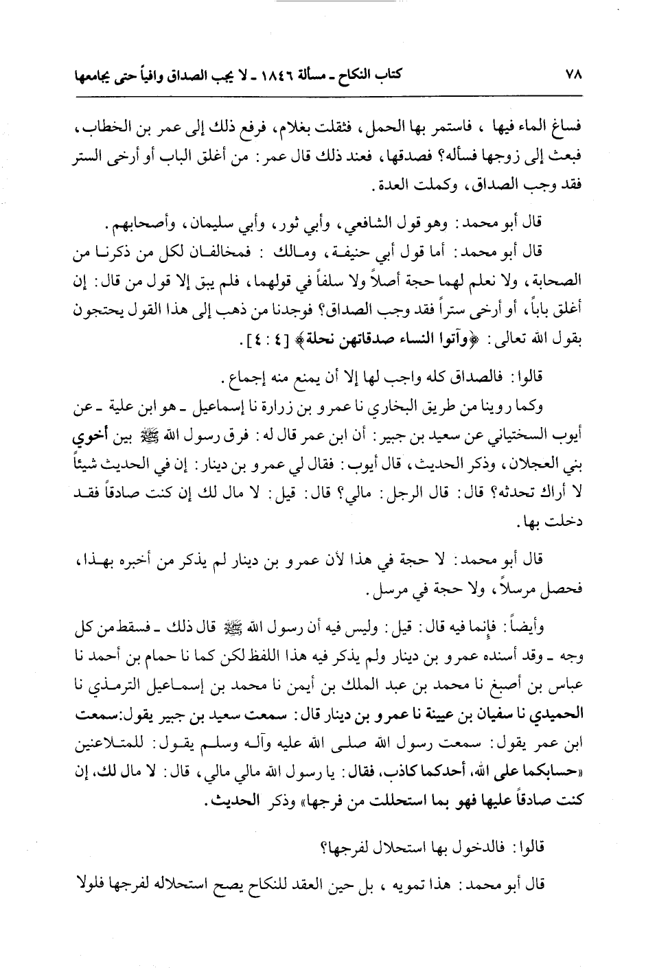 قَالُوا: فَالدُّخُولُ بِهَا اسْتِحْلَالٌ لِفَرْجِهَا؟ قَالَ أَبُو مُحَمَّدٍ: هَذَا تَمْوِيهٌ، بَلْ حِينَ الْعَقْدِ لِلنِّكَاحِ يَصِحُّ اسْتِحْلَالُهُ لِفَرْجِهَا فَلَوْلَا