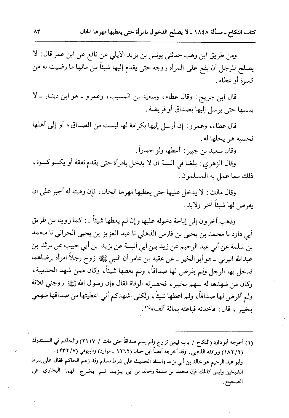 وَذَهَبَ آخَرُونَ إلَى إبَاحَةِ دُخُولِهِ عَلَيْهَا وَإِنْ لَمْ يُعْطِهَا شَيْئًا -: كَمَا رُوِّينَا مِنْ طَرِيقِ أَبِي دَاوُد نا مُحَمَّدُ بْنُ يَحْيَى بْنُ فَارِسٍ الذُّهْلِيُّ نا عَبْدُ الْعَزِيزِ بْنُ يَحْيَى الْحَرَّانِيُّ نا مُحَمَّدُ بْنُ سَلَمَةَ عَنْ أَبِي عَبْدِ الرَّحِيمِ عَنْ زَيْدِ بْنِ أَبِي أُنَيْسَةَ عَنْ يَزِيدَ بْنِ أَبِي حَبِيبٍ عَنْ مَرْثَدِ بْنِ عَبْدِ اللَّهِ الْيَزَنِيِّ - هُوَ أَبُو الْخَيْرِ - عَنْ عُقْبَةَ بْنِ عَامِرٍ «أَنَّ النَّبِيَّ - صَلَّى اللَّهُ عَلَيْهِ وَسَلَّمَ - زَوَّجَ رَجُلًا امْرَأَةً بِرِضَاهُمَا فَدَخَلَ بِهَا الرَّجُلُ وَلَمْ يَفْرِضْ لَهَا صَدَاقًا، وَلَمْ يُعْطِهَا شَيْئًا، وَكَانَ مِمَّنْ شَهِدَ الْحُدَيْبِيَةَ، وَكَانَ مَنْ شَهِدَهَا لَهُ سَهْمٌ بِخَيْبَرَ، فَحَضَرَتْهُ الْوَفَاةُ فَقَالَ إنَّ رَسُولَ اللَّهِ - صَلَّى اللَّهُ عَلَيْهِ وَسَلَّمَ - زَوَّجَنِي فُلَانَةَ وَلَمْ أَفْرِضْ لَهَا صَدَاقًا، وَلَمْ أُعْطِهَا شَيْئًا، وَلَكِنِّي أُشْهِدُكُمْ أَنِّي أَعْطَيْتُهَا مِنْ صَدَاقِهَا سَهْمِي بِخَيْبَرَ، قَالَ: فَأَخَذَتْهُ فَبَاعَتْهُ بِمِائَةِ أَلْفٍ» .