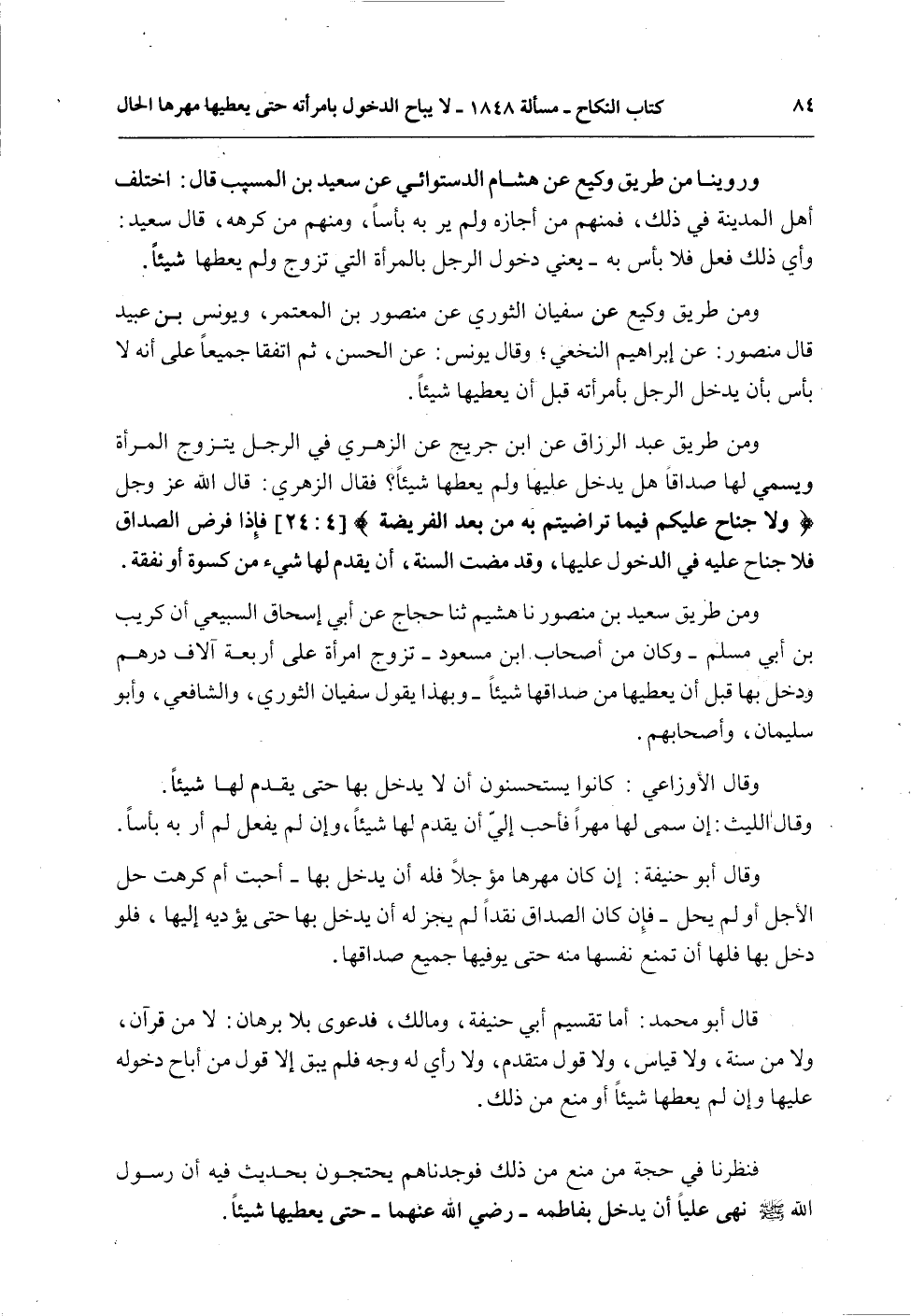 وَرُوِّينَا مِنْ طَرِيقِ وَكِيعٍ عَنْ هِشَامٍ الدَّسْتُوَائِيِّ عَنْ سَعِيدِ بْنِ الْمُسَيِّبِ قَالَ: اخْتَلَفَ أَهْلُ الْمَدِينَةِ فِي ذَلِكَ، فَمِنْهُمْ مَنْ أَجَازَهُ وَلَمْ يَرَ بِهِ بَأْسًا، وَمِنْهُمْ مَنْ كَرِهَهُ، قَالَ سَعِيدٌ: وَأَيُّ ذَلِكَ فَعَلَ فَلَا بَأْسَ بِهِ - يَعْنِي دُخُولَ الرَّجُلِ بِالْمَرْأَةِ الَّتِي تَزَوَّجَ وَلَمْ يُعْطِهَا شَيْئًا.