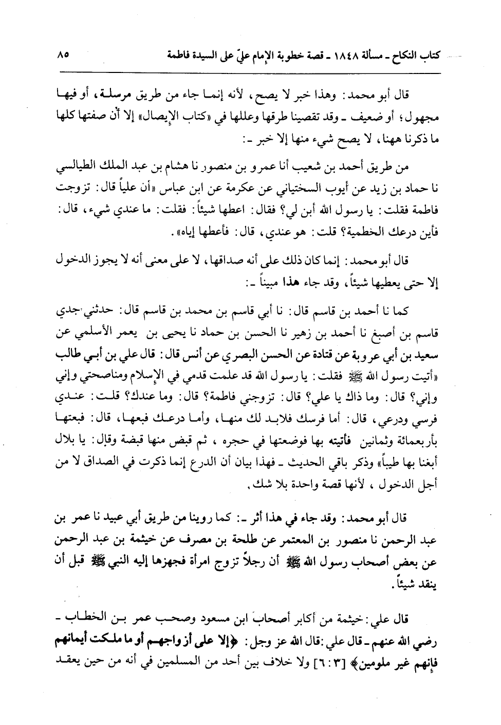 قَالَ أَبُو مُحَمَّدٍ: إنَّمَا كَانَ ذَلِكَ عَلَى أَنَّهُ صَدَاقُهَا، لَا عَلَى مَعْنَى أَنَّهُ لَا يَجُوزُ الدُّخُولُ إلَّا حَتَّى يُعْطِيَهَا شَيْئًا، وَقَدْ جَاءَ هَذَا مُبَيَّنًا -: كَمَا نا أَحْمَدُ بْنُ قَاسِمٍ قَالَ: نا أَبِي قَاسِمُ بْنُ مُحَمَّدِ بْنِ قَاسِمٍ قَالَ: حَدَّثَنِي جَدِّي قَاسِمُ بْنُ أَصْبَغَ نا أَحْمَدُ بْنُ زُهَيْرٍ نا الْحَسَنُ بْنُ حَمَّادٍ نا يَحْيَى بْنُ يَعْمُرَ الْأَسْلَمِيُّ عَنْ سَعِيدِ بْنِ أَبِي عَرُوبَةَ عَنْ قَتَادَةَ عَنْ الْحَسَنِ الْبَصْرِيِّ عَنْ أَنَسٍ قَالَ: قَالَ عَلِيُّ بْنُ أَبِي طَالِبٍ «أَتَيْتُ رَسُولَ اللَّهِ - صَلَّى اللَّهُ عَلَيْهِ وَسَلَّمَ - فَقُلْتُ: يَا رَسُولَ اللَّهِ قَدْ عَلِمْتَ قِدَمِي فِي الْإِسْلَامِ وَمُنَاصَحَتِي وَإِنِّي وَإِنِّي؟ قَالَ: وَمَا ذَاكَ يَا عَلِيٌّ؟ قَالَ: تُزَوِّجُنِي فَاطِمَةَ؟ قَالَ: مَا عِنْدَكَ؟ قُلْتُ: عِنْدِي فَرَسِي وَدِرْعِي، قَالَ: أَمَّا فَرَسُكَ فَلَا بُدَّ لَكَ مِنْهَا، وَأَمَّا دِرْعُكَ فَبِعْهَا، قَالَ: فَبِعْتُهَا بِأَرْبَعِمِائَةٍ وَثَمَانِينَ فَأَتَيْتُهُ بِهَا فَوَضَعْتُهَا فِي حِجْرِهِ، ثُمَّ قَبَضَ مِنْهَا قَبْضَةً وَقَالَ: يَا بِلَالُ أَبْغِنَا بِهَا طِيبًا» وَذَكَرَ بَاقِيَ الْحَدِيثِ - فَهَذَا بَيَانٌ أَنَّ الدِّرْعَ إنَّمَا ذُكِرَتْ فِي الصَّدَاقِ لَا مِنْ أَجْلِ الدُّخُولِ، لِأَنَّهَا قِصَّةٌ وَاحِدَةٌ بِلَا شَكٍّ.