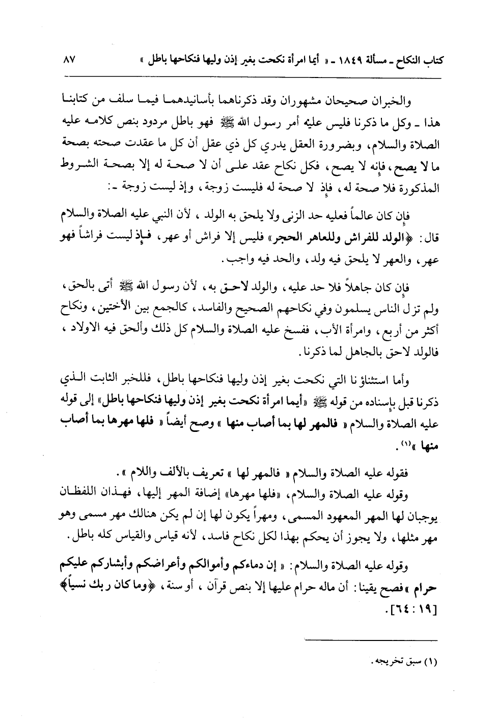 وَالْخَبَرَانِ صَحِيحَانِ مَشْهُورَانِ وَقَدْ ذَكَرْنَاهُمَا بِأَسَانِيدِهِمَا فِيمَا سَلَفَ مِنْ كِتَابِنَا هَذَا - وَكُلُّ مَا ذَكَرْنَا فَلَيْسَ عَلَيْهِ أَمْرُ رَسُولِ اللَّهِ - صَلَّى اللَّهُ عَلَيْهِ وَسَلَّمَ - فَهُوَ بَاطِلٌ مَرْدُودٌ بِنَصِّ كَلَامِهِ - عَلَيْهِ الصَّلَاةُ وَالسَّلَامُ - وَبِضَرُورَةِ الْعَقْلِ، يَدْرِي كُلُّ ذِي عَقْلٍ أَنَّ كُلَّ مَا عُقِدَتْ صِحَّتُهُ بِصِحَّةِ مَا لَا يَصِحُّ، فَإِنَّهُ لَا يَصِحُّ، فَكُلُّ نِكَاحٍ عُقِدَ عَلَى أَنْ لَا صِحَّةَ لَهُ إلَّا بِصِحَّةِ الشُّرُوطِ الْمَذْكُورَةِ فَلَا صِحَّةَ لَهُ فَإِذْ لَا صِحَّةَ لَهُ فَلَيْسَتْ زَوْجَةً، وَإِذْ لَيْسَتْ زَوْجَةً -: فَإِنْ كَانَ عَالِمًا فَعَلَيْهِ حَدُّ الزِّنَا وَلَا يَلْحَقُ بِهِ الْوَلَدُ لِأَنَّ النَّبِيَّ - عَلَيْهِ الصَّلَاةُ وَالسَّلَامُ - قَالَ: «الْوَلَدُ لِلْفِرَاشِ وَلِلْعَاهِرِ الْحَجَرُ» فَلَيْسَ إلَّا فِرَاشٌ أَوْ عِهْرٌ، فَإِذْ لَيْسَتْ فِرَاشًا فَهُوَ عِهْرٌ، وَالْعِهْرُ لَا يُلْحَقُ فِيهِ وَلَدٌ، وَالْحَدُّ فِيهِ وَاجِبٌ.
