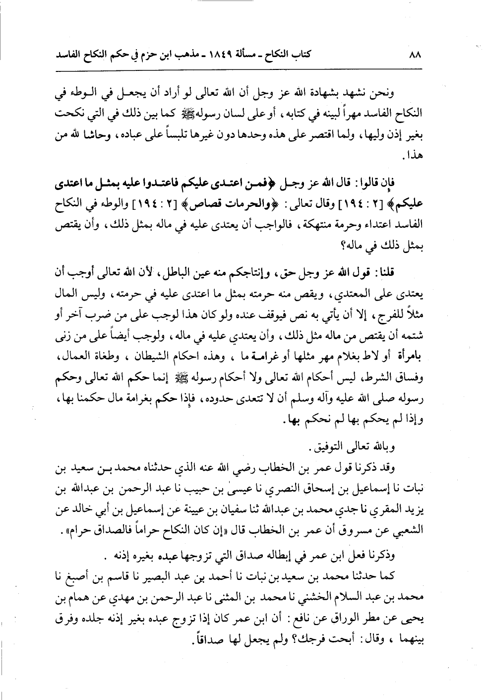 قُلْنَا: قَوْلُ اللَّهِ عَزَّ وَجَلَّ حَقٌّ، وَإِنْتَاجُكُمْ مِنْهُ عَيْنُ الْبَاطِلِ؛ لِأَنَّ اللَّهَ تَعَالَى أَوْجَبَ أَنْ يُعْتَدَى عَلَى الْمُعْتَدِي، وَيُقَصَّ مِنْهُ حُرْمَتُهُ بِمِثْلِ مَا اعْتَدَى عَلَيْهِ فِي حُرْمَتِهِ، وَلَيْسَ الْمَالُ مِثْلًا لِلْفَرْجِ، إلَّا أَنْ يَأْتِيَ بِهِ نَصٌّ فَيُوقَفُ عِنْدَهُ وَلَوْ كَانَ هَذَا لَوَجَبَ عَلَى مَنْ ضَرَبَ آخَرَ أَوْ شَتَمَهُ أَنْ يُقْتَصَّ مِنْ مَالِهِ مِثْلُ ذَلِكَ، وَأَنْ يُعْتَدَىَ عَلَيْهِ فِي مَالِهِ، وَلَوَجَبَ أَيْضًا عَلَى مَنْ زَنَى بِامْرَأَةٍ أَوْ لَاطَ بِغُلَامٍ مَهْرُ مِثْلِهَا أَوْ غَرَامَةٌ مَا، وَهَذِهِ أَحْكَامُ الشَّيْطَانِ، وَطُغَاةِ الْعُمَّالِ، وَفُسَّاقِ الشُّرَطِ، لَيْسَ أَحْكَامَ اللَّهِ تَعَالَى وَلَا أَحْكَامَ رَسُولِهِ - صَلَّى اللَّهُ عَلَيْهِ وَسَلَّمَ - إنَّمَا حُكْمُ اللَّهِ تَعَالَى وَحُكْمُ رَسُولِهِ - صَلَّى اللَّهُ عَلَيْهِ وَآلِهِ وَسَلَّمَ - أَنْ لَا تُتَعَدَّى حُدُودُهُ، فَإِذَا حَكَمَ بِغَرَامَةِ مَالٍ حَكَمْنَا بِهَا، وَإِذَا لَمْ يَحْكُمْ بِهَا لَمْ نَحْكُمْ بِهَا.