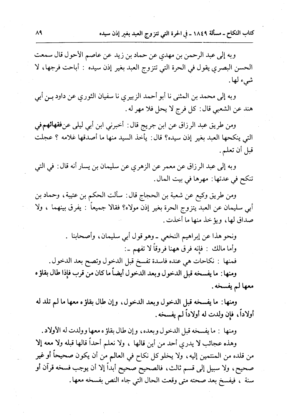 وَبِهِ إلَى عَبْدِ الرَّحْمَنِ بْنِ مَهْدِيٍّ عَنْ حَمَّادِ بْنِ زَيْدٍ عَنْ عَاصِمٍ الْأَحْوَلِ قَالَ سَمِعْت الْحَسَنَ الْبَصْرِيَّ يَقُولُ فِي الْحُرَّةِ الَّتِي تَتَزَوَّجُ الْعَبْدَ بِغَيْرِ إذْنِ سَيِّدِهِ: أَبَاحَتْ فَرْجَهَا، لَا شَيْءَ لَهَا.