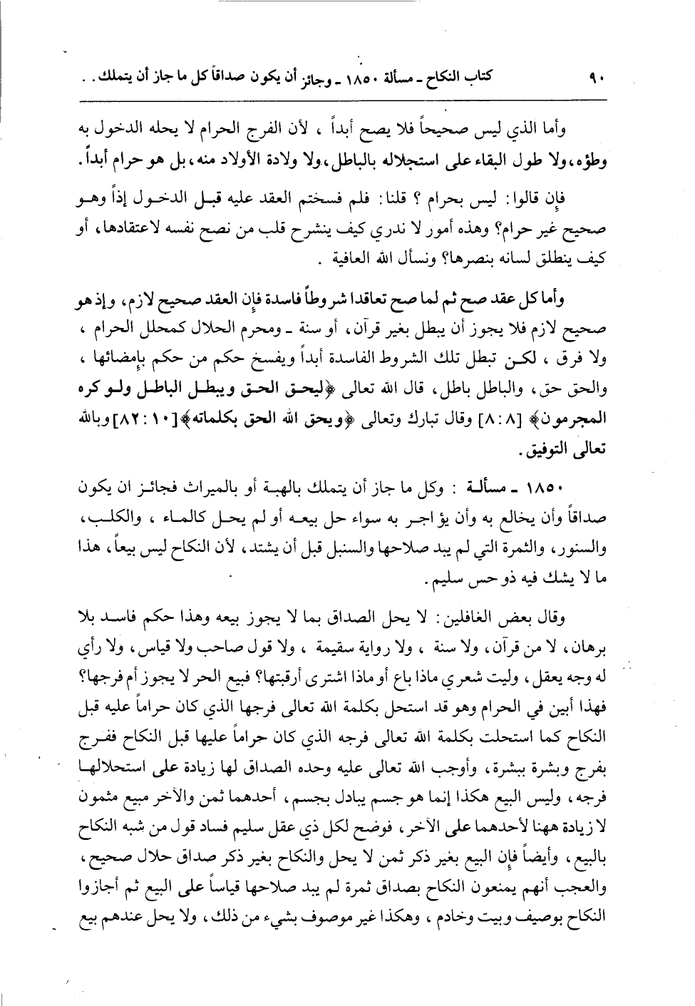 1850 - مَسْأَلَةٌ: وَكُلُّ مَا جَازَ أَنْ يُتَمَلَّكَ بِالْهِبَةِ أَوْ بِالْمِيرَاثِ فَجَائِزٌ أَنْ يَكُون صَدَاقًا وَأَنْ يُخَالَعَ بِهِ وَأَنْ يُؤَاجَرَ بِهِ سَوَاءٌ حَلَّ بَيْعُهُ أَوْ لَمْ يَحِلَّ كَالْمَاءِ، وَالْكَلْبِ، وَالسِّنَّوْرِ، وَالثَّمَرَةِ الَّتِي لَمْ يَبْدُ صَلَاحُهَا وَالسُّنْبُلِ قَبْلَ أَنْ يَشْتَدَّ، لِأَنَّ النِّكَاحَ لَيْسَ بَيْعًا، هَذَا مَا لَا يَشُكُّ فِيهِ ذُو حِسٍّ سَلِيمٍ.