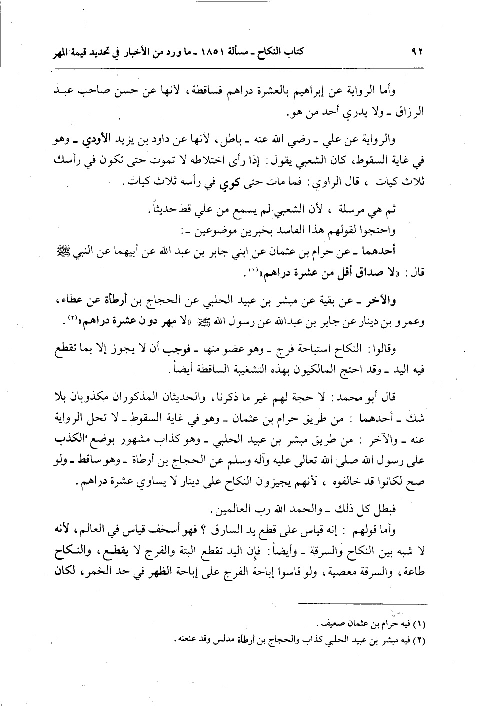قَالَ أَبُو مُحَمَّدٍ: لَا حُجَّةَ لَهُمْ غَيْرُ مَا ذَكَرْنَا، وَالْحَدِيثَانِ الْمَذْكُورَانِ مَكْذُوبَانِ بِلَا شَكٍّ - أَحَدُهُمَا: مِنْ طَرِيقِ حَرَامِ بْنِ عُثْمَانَ - وَهُوَ فِي غَايَةِ السُّقُوطِ - لَا تَحِلُّ الرِّوَايَةُ عَنْهُ - وَالْآخَرُ: مِنْ طَرِيقِ مُبَشِّرِ بْنِ عُبَيْدٍ الْحَلَبِيِّ - وَهُوَ كَذَّابٌ مَشْهُورٌ بِوَضْعِ الْكَذِبِ عَلَى رَسُولِ اللَّهِ - صَلَّى اللَّهُ تَعَالَى عَلَيْهِ وَآلِهِ وَسَلَّمَ - عَنْ الْحَجَّاجِ بْنِ أَرْطَاةَ - وَهُوَ سَاقِطٌ - وَلَوْ صَحَّ لَكَانُوا قَدْ خَالَفُوهُ، لِأَنَّهُمْ يُجِيزُونَ النِّكَاحَ عَلَى دِينَارٍ لَا يُسَاوِي عَشَرَةَ دَرَاهِمَ.