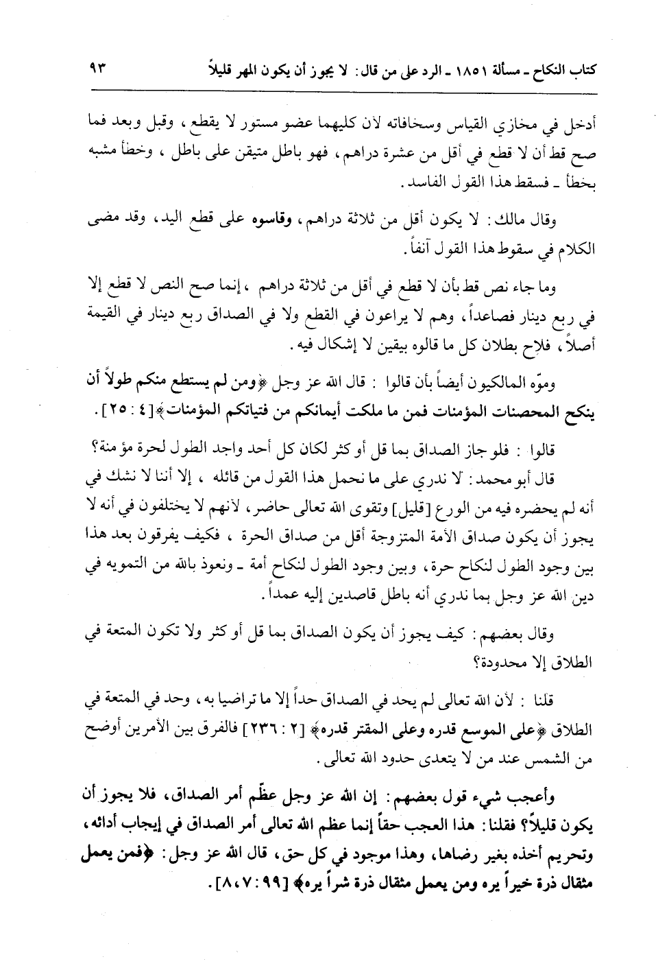 وَأَعْجَبُ شَيْءٍ قَوْلُ بَعْضِهِمْ: إنَّ اللَّهَ عَزَّ وَجَلَّ عَظَّمَ أَمْرَ الصَّدَاقِ، فَلَا يَجُوزُ أَنْ يَكُونَ قَلِيلًا؟ قُلْنَا: هَذَا الْعَجَبُ حَقًّا إنَّمَا عَظَّمَ اللَّهُ تَعَالَى أَمْرَ الصَّدَاقِ فِي إيجَابِ أَدَائِهِ، وَتَحْرِيمِ أَخْذِهِ بِغَيْرِ رِضَاهَا، وَهَذَا مَوْجُودٌ فِي كُلِّ حَقٍّ، قَالَ اللَّهُ عَزَّ وَجَلَّ: {فَمَنْ يَعْمَلْ مِثْقَالَ ذَرَّةٍ خَيْرًا يَرَهُ} [الزلزلة: 7] {وَمَنْ يَعْمَلْ مِثْقَالَ ذَرَّةٍ شَرًّا يَرَهُ} [الزلزلة: 8] .