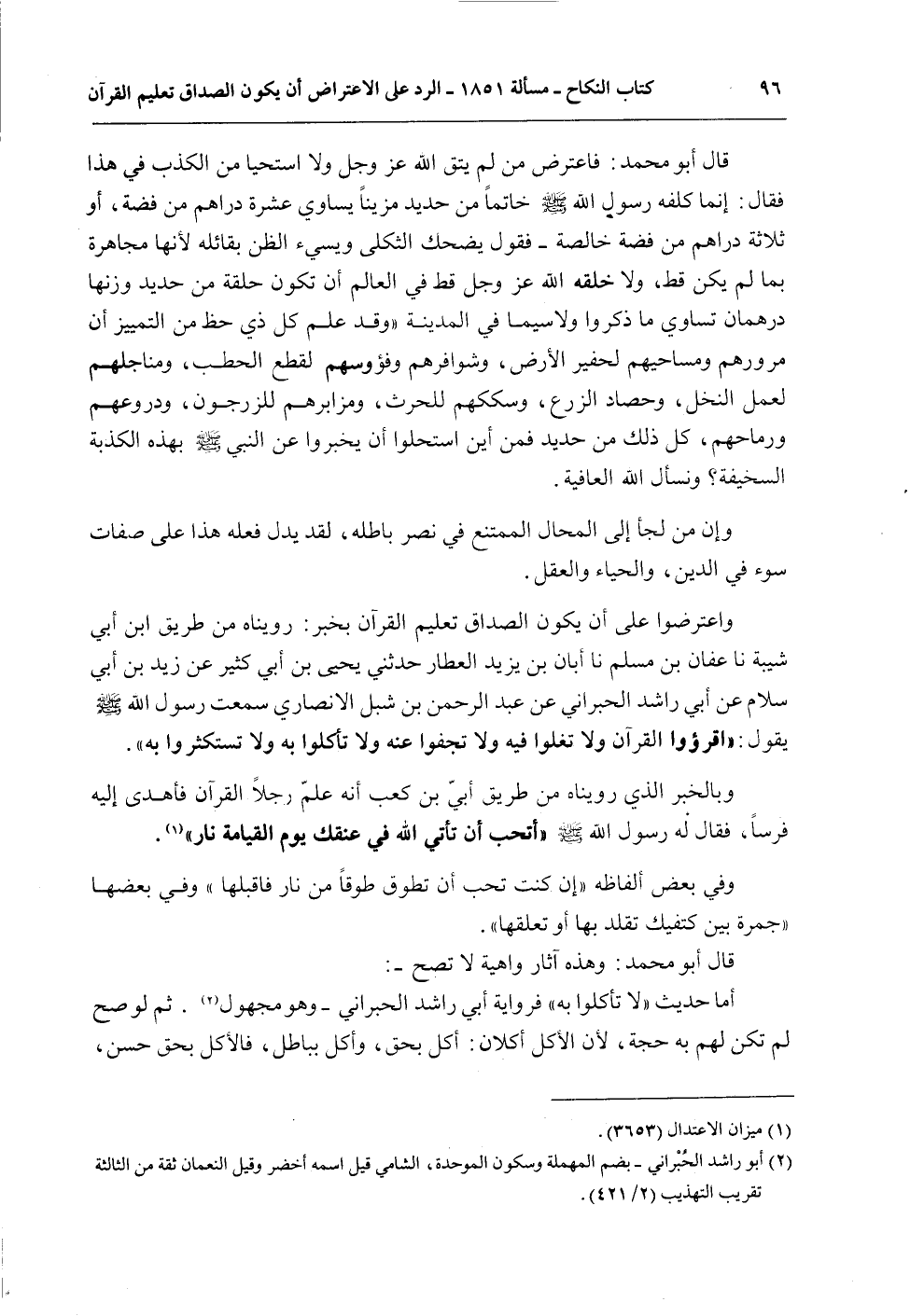 وَاعْتَرَضُوا عَلَى أَنْ يَكُونَ الصَّدَاقُ تَعْلِيمَ الْقُرْآنِ بِخَبَرٍ: رُوِّينَاهُ مِنْ طَرِيقِ ابْنِ أَبِي شَيْبَةَ نا عَفَّانُ بْنُ مُسْلِمٍ نا أَبَانُ بْنُ يَزِيدَ الْعَطَّارُ حَدَّثَنِي يَحْيَى بْنُ أَبِي كَثِيرٍ عَنْ زَيْدِ بْنِ أَبِي سَلَامٍ عَنْ أَبِي رَاشِدٍ الْحُبْرَانِيِّ عَنْ عَبْدِ الرَّحْمَنِ بْنِ شِبْلٍ الْأَنْصَارِيِّ سَمِعْتُ رَسُولَ اللَّهِ - صَلَّى اللَّهُ عَلَيْهِ وَسَلَّمَ - يَقُولُ: «اقْرَءُوا الْقُرْآنَ وَلَا تَغْلُوا فِيهِ وَلَا تَجْفُوَا عَنْهُ وَلَا تَأْكُلُوا بِهِ وَلَا تَسْتَكْثِرُوا بِهِ» .