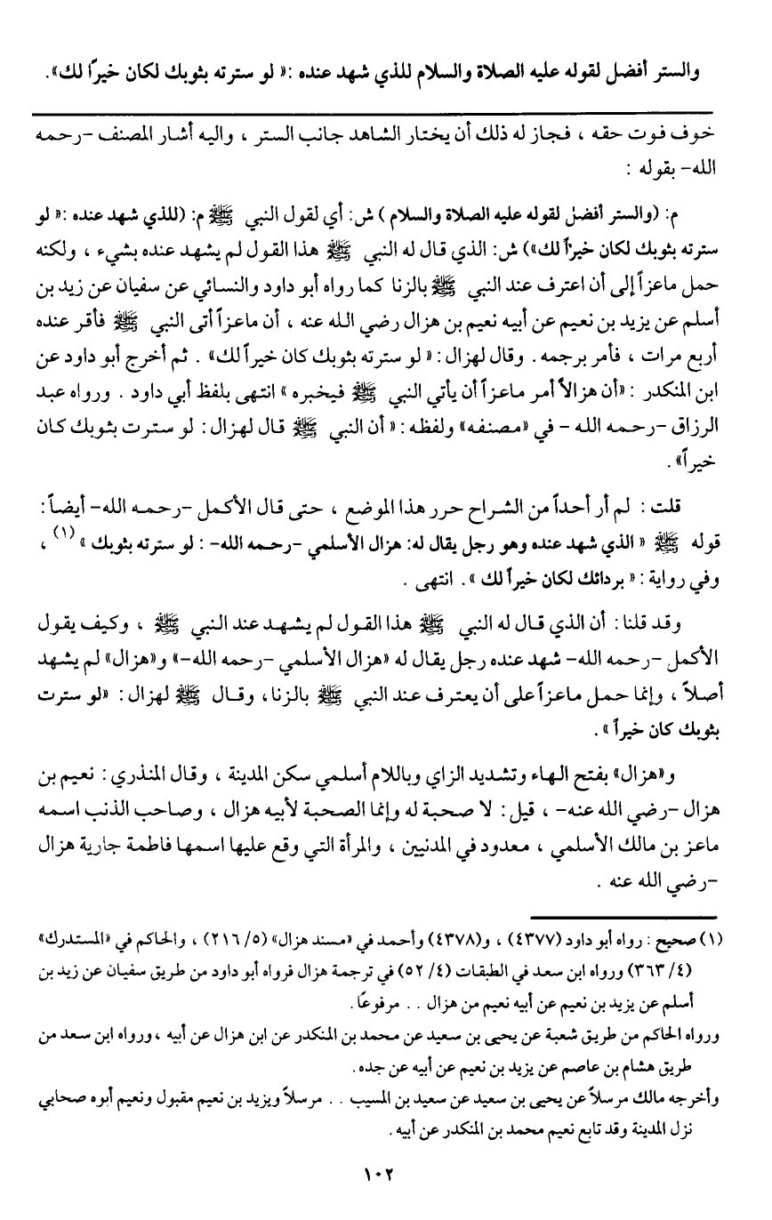 وقد قلنا: إن الذي قال له النبي - صَلَّى اللَّهُ عَلَيْهِ وَسَلَّمَ - هذا القول لم يشهد عند النبي - صَلَّى اللَّهُ عَلَيْهِ وَسَلَّمَ -، وكيف يقول الأكمل - رَحِمَهُ اللَّهُ - شهد عنده رجل يقال له: " هزال الأسلمي - رَحِمَهُ اللَّهُ -" و" هزال " لم يشهد أصلا وإنما حمل ماعزا على أن يعترف عند النبي - صَلَّى اللَّهُ عَلَيْهِ وَسَلَّمَ - بالزنا، وقال - صَلَّى اللَّهُ عَلَيْهِ وَسَلَّمَ - لهزال: «لو سترت بثوبك كان خيرا» .