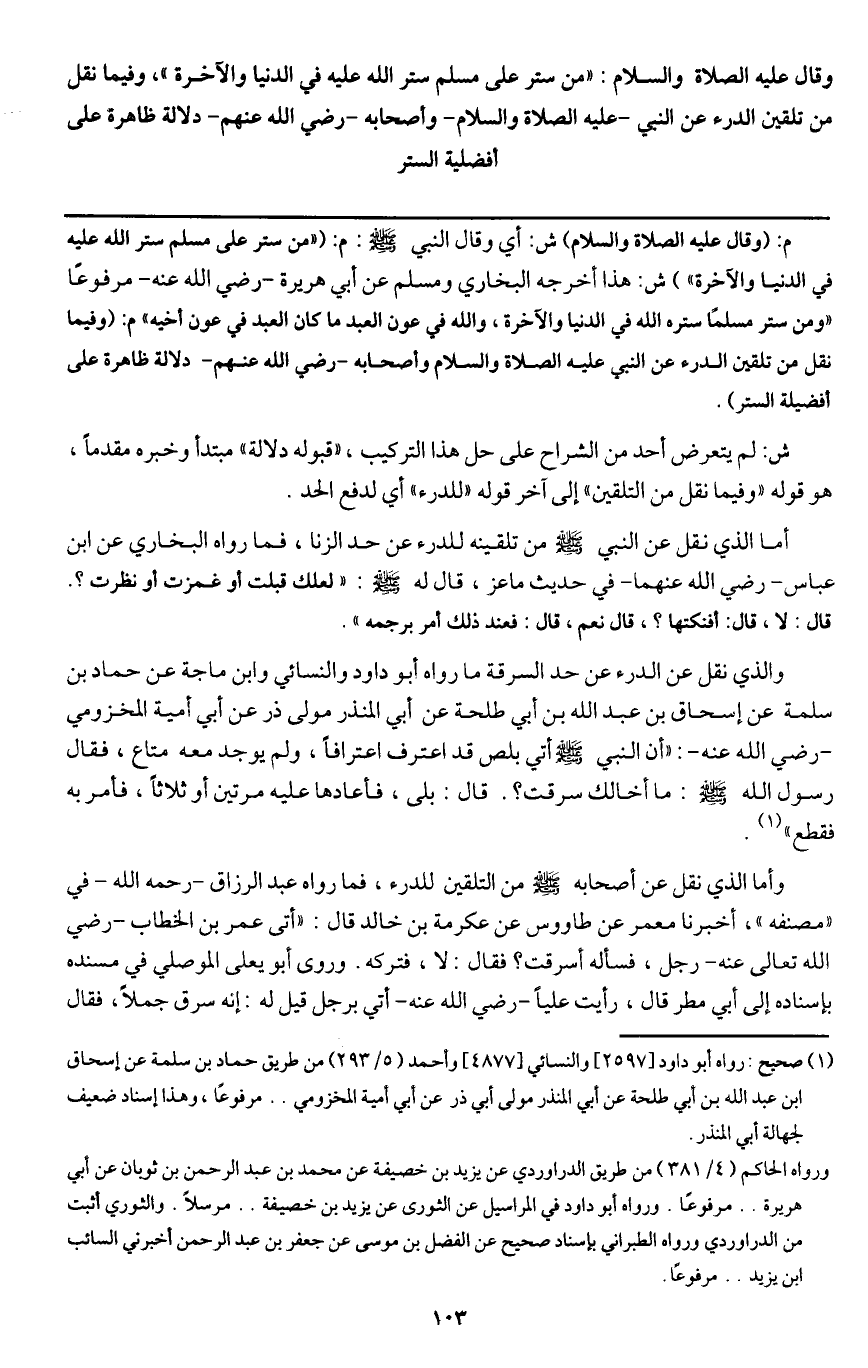 وقال - عَلَيْهِ الصَّلَاةُ وَالسَّلَامُ -: «من ستر على مسلم ستر الله عليه في الدنيا والآخرة» ، وفيما نقل من تلقين الدرء عن النبي - عَلَيْهِ الصَّلَاةُ وَالسَّلَامُ - وأصحابه - رَضِيَ اللَّهُ عَنْهُمْ - دلالة ظاهرة على أفضلية الستر