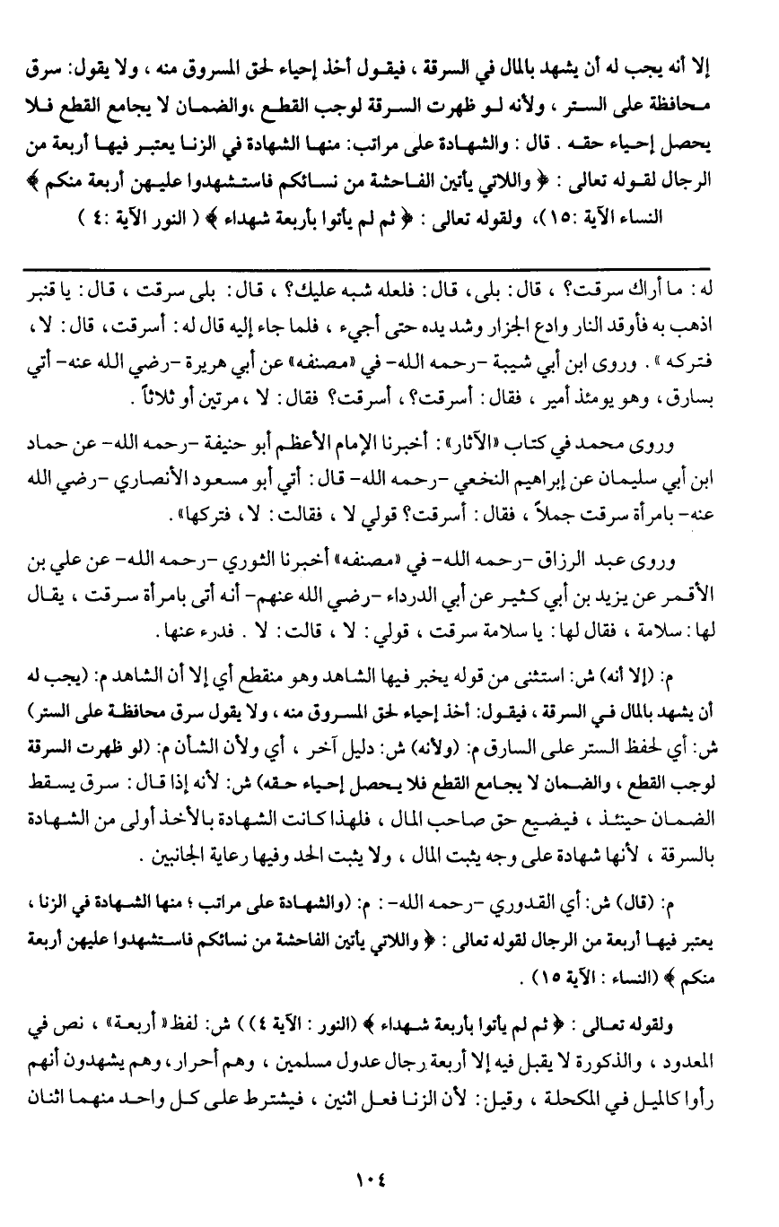 قال: والشهادة على مراتب: منها الشهادة في الزنا يعتبر فيها أربعة من الرجال لِقَوْلِهِ تَعَالَى: {وَاللَّاتِي يَأْتِينَ الْفَاحِشَةَ مِنْ نِسَائِكُمْ فَاسْتَشْهِدُوا عَلَيْهِنَّ أَرْبَعَةً مِنْكُمْ} [النساء: 15] (النساء الآية: 15) ، ولقوله تعالى: {ثُمَّ لَمْ يَأْتُوا بِأَرْبَعَةِ شُهَدَاءَ} [النور: 4] (النور الآية: 4)
