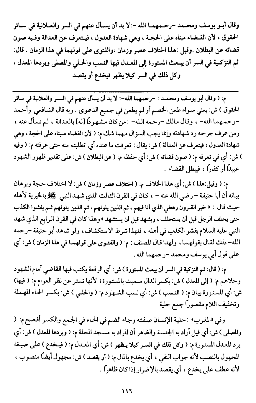 وقال أبو يوسف ومحمد - رحمهما الله -: لا بد أن يسأل عنهم في السر والعلانية في سائر الحقوق، لأن القضاء مبناه على الحجة، وهي شهادة العدول، فيتعرف عن العدالة وفيه صون قضائه عن البطلان وقيل هذا اختلاف عصر وزمان والفتوى على قولهما في هذا الزمان، قال: ثم التزكية في السر أن يبعث المستورة إلى المعدل فيها النسب والحلي والمصلى ويردها المعدل، وكل ذلك في السر كيلا يظهر فيخدع أو يقصد