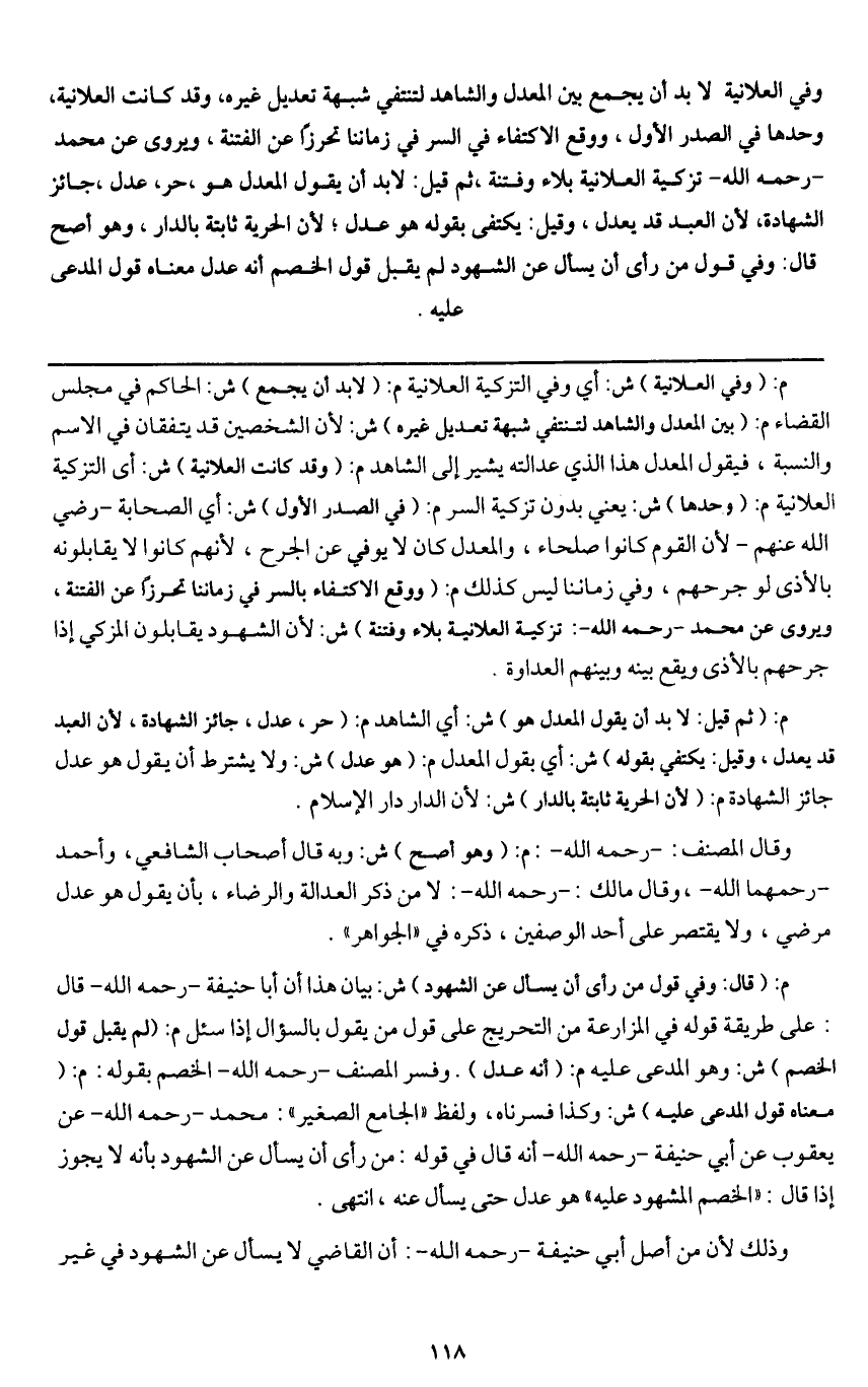 وفي العلانية لا بد أن يجمع بين المعدل والشاهد لتنتفي شبهة تعديل غيره، وقد كانت العلانية، وحدها في الصدر الأول، ووقع الاكتفاء في السر في زماننا تحرزا عن الفتنة، ويروى عن محمد - رَحِمَهُ اللَّهُ - تزكية العلانية بلاء وفتنة، ثم قيل: لا بد أن يقول المعدل: هو، حر، عدل، جائز الشهادة، لأن العبد قد يعدل، وقيل: يكتفى بقوله: هو عدل؛ لأن الحرية ثابتة بالدار، وهو أصح، قال: وفي قول من رأى أن يسأل عن الشهود لم يقبل قول الخصم أنه عدل معناه قول المدعى عليه.