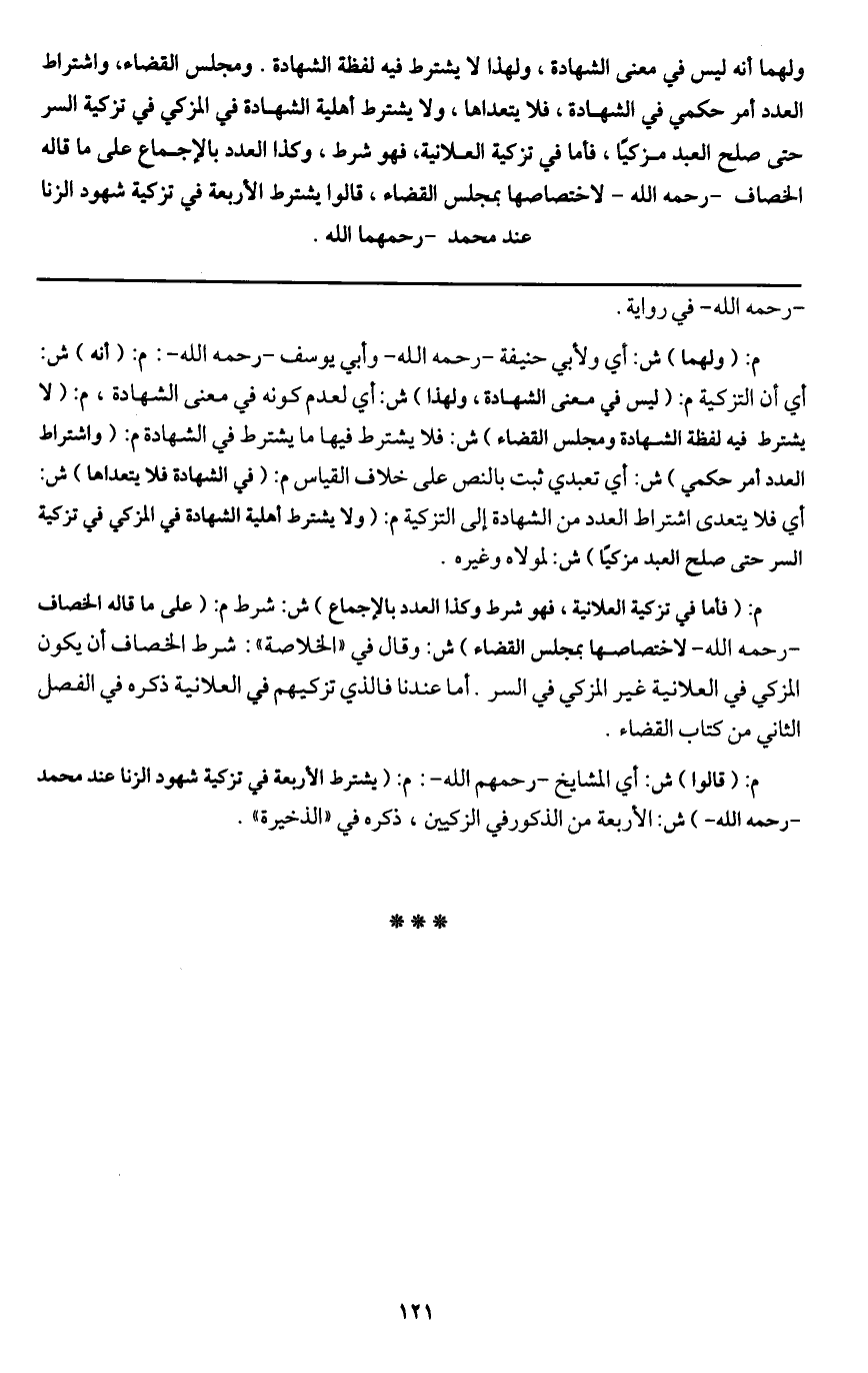 م: (قالوا) ش: أي المشايخ - رَحِمَهُمُ اللَّهُ -: م: (يشترط الأربعة في تزكية شهود الزنا عند محمد - رَحِمَهُ اللَّهُ -) ش: الأربعة من الذكور في الزكيين، ذكره في " الذخيرة ".