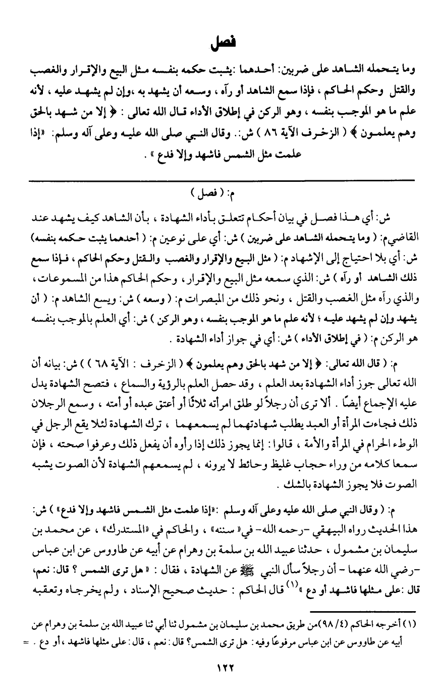 فصل وما يتحمله الشاهد على ضربين: أحدهما: يثبت حكمه بنفسه مثل الربيع والإقرار والغصب والقتل وحكم الحاكم، فإذا سمع الشاهد أو رآه، وسعه أن يشهد به، وإن لم يشهد عليه؛ لأنه علم ما هو الموجب بنفسه، وهو الركن في إطلاق الأداء قال الله تعالى: {إِلَّا مَنْ شَهِدَ بِالْحَقِّ وَهُمْ يَعْلَمُونَ} [الزخرف: 86] (الزخرف الآية 86) ش: وقال النبي - صَلَّى اللَّهُ عَلَيْهِ وَعَلَى آلِهِ - وسلم: «إذا علمت مثل الشمس فاشهد وإلا فدع» .