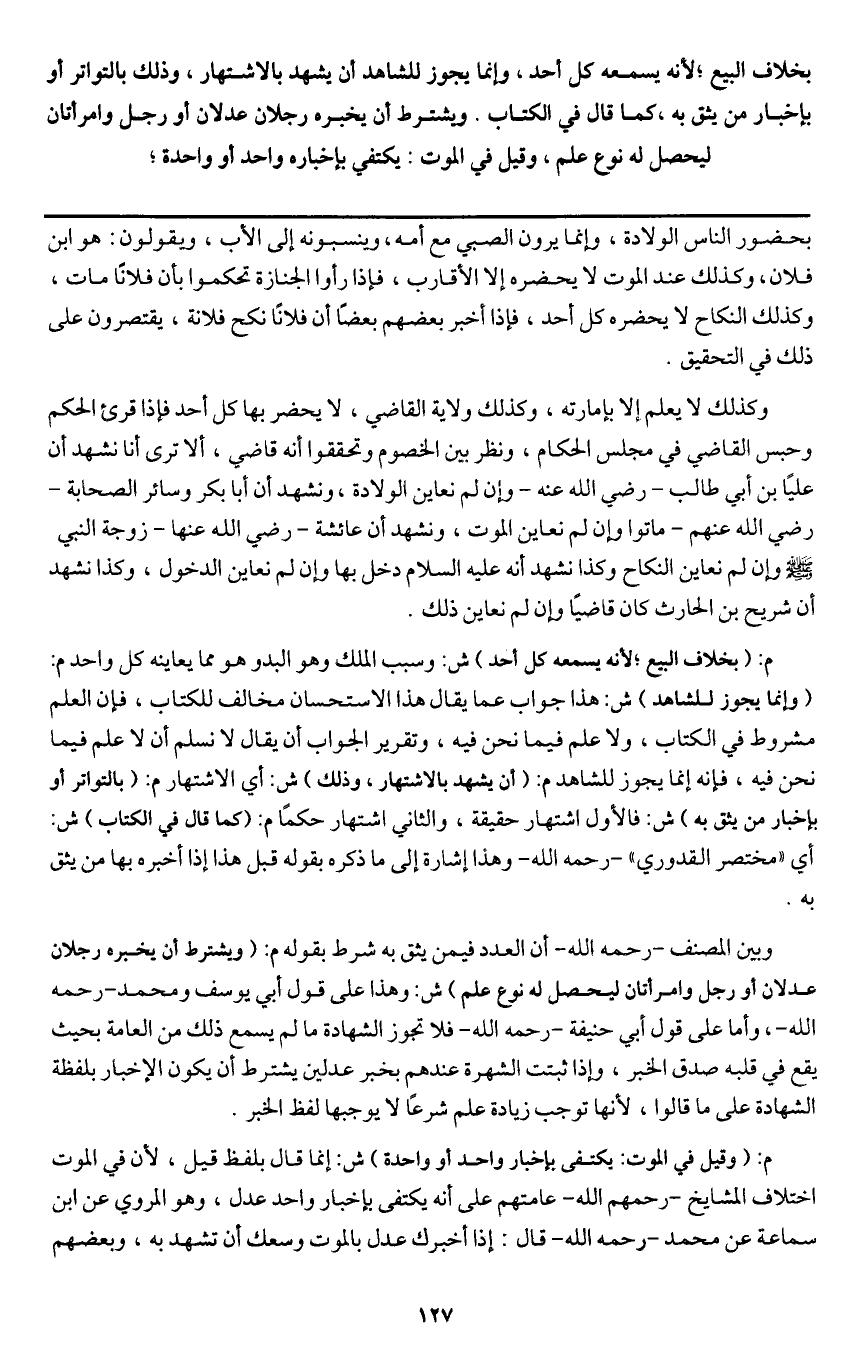 ـــــــــــــــــــــــــــــQبحضور الناس الولادة، وإنما يرون الصبي مع أمه، وينسبونه إلى الأب، ويقولون: هو ابن فلان، وكذلك عند الموت لا يحضره إلا الأقارب، فإذا رأوا الجنازة تحكموا بأن فلانا مات، وكذلك النكاح لا يحضره كل أحد، فإذا أخبر بعضهم بعضا أن فلانا نكح فلانة، يقتصرون على ذلك في التحقيق.
