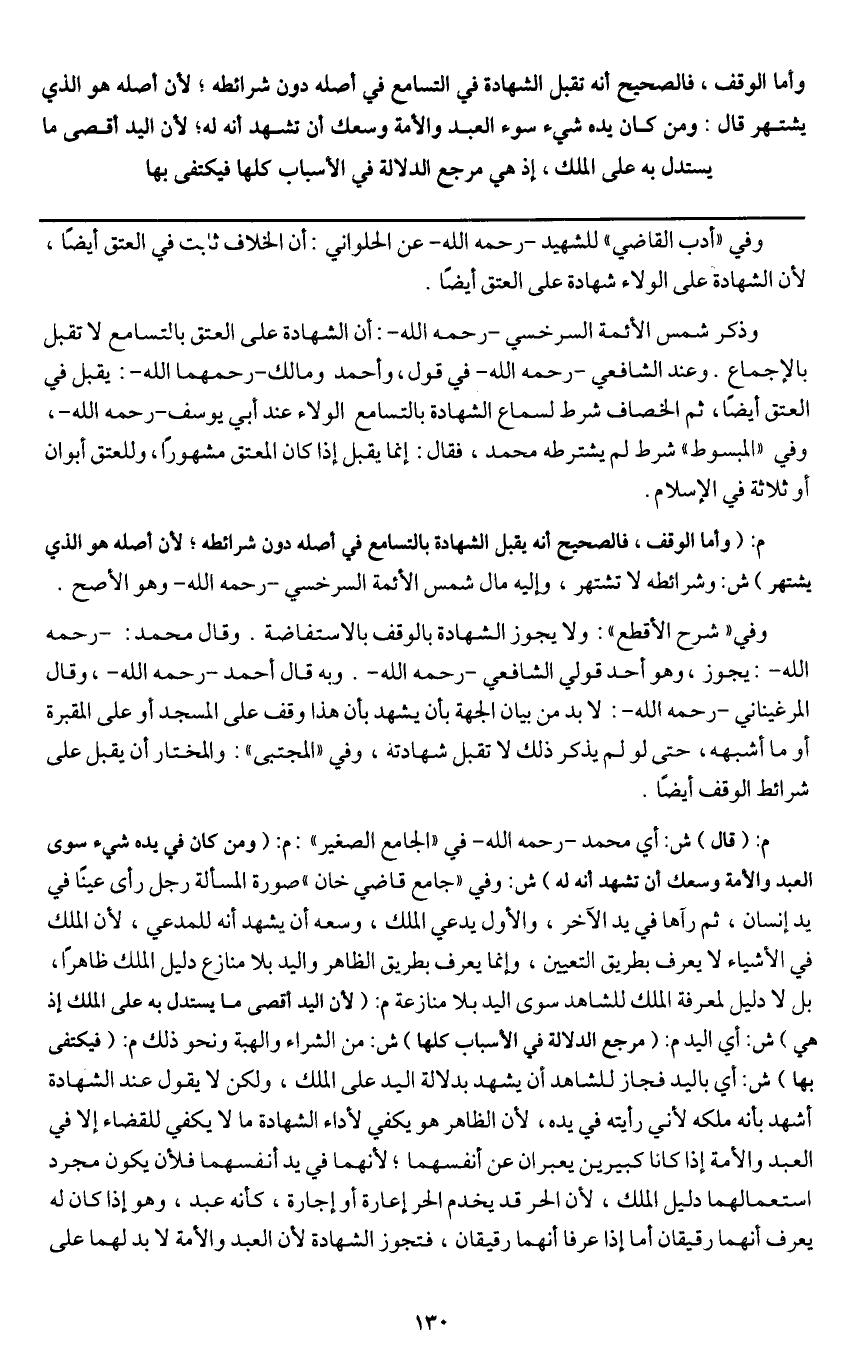 وذكر شمس الأئمة السرخسي - رَحِمَهُ اللَّهُ -: أن الشهادة على العتق بالتسامع لا تقبل بالإجماع. وعند الشافعي - رَحِمَهُ اللَّهُ - في قول، وأحمد ومالك - رحمهما الله -: يقبل في العتق أيضاً، ثم الخصاف شرط لسماع الشهادة بالتسامع الولاء عند أبي يوسف - رَحِمَهُ اللَّهُ -، وفي " المبسوط " شرط لم يشترطه محمد، فقال: إنما يقبل إذا كان المعتق مشهوراً، وللعتق أبوان أو ثلاثة في الإسلام.