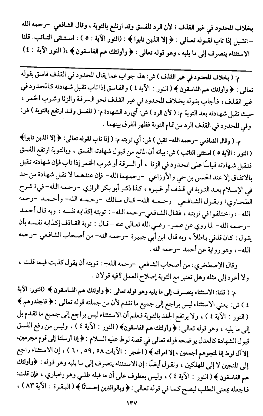 م: (قلنا: الاستثناء ينصرف إلى ما يليه وهو قَوْله تَعَالَى: {وَأُولَئِكَ هُمُ الْفَاسِقُونَ} [النور: 4] (النور: الآية 4)) ش: يعني الاستثناء ليس براجع إلى جميع ما تقدم لأن من جملته قَوْله تَعَالَى: {فَاجْلِدُوهُمْ} [النور: 4] (النور: الآية 4) ، ولا يرتفع الجلد بالتوبة فعلم أن الاستثناء ليس براجع إلى جميع ما تقدم بل إلى ما يليه، وهو قَوْله تَعَالَى: {وَأُولَئِكَ هُمُ الْفَاسِقُونَ} [النور: 4] (النور: الآية 4) ، وليس من رفع الفسق قبول الشهادة كالعدل يوضحه قَوْله تَعَالَى في قصة لوط - عَلَيْهِ السَّلَامُ -: {إِنَّا أُرْسِلْنَا إِلَى قَوْمٍ مُجْرِمِينَ} [الحجر: 58] {إِلَّا آلَ لُوطٍ إِنَّا لَمُنَجُّوهُمْ أَجْمَعِينَ} [الحجر: 59] {إِلَّا امْرَأَتَهُ} [الحجر: 60] (الحجر: الآيات 58، 59، 60) ، إن الاستثناء راجع إلى المنجين لا إلى المهلكين، ونقول أيضاً: إن الاستثناء ينصرف إلى ما يليه وهو قوله: {وَأُولَئِكَ هُمُ الْفَاسِقُونَ} [النور: 4] (النور: الآية 4) ، وليس بمعطوف على أن ما قبله طلبي وهو إخباري، فإن قلت: فاجعله بمعنى الطلب ليصح كما في قَوْله تَعَالَى: {وَبِالْوَالِدَيْنِ إِحْسَانًا} [البقرة: 83] (البقرة: الآية 83) ،