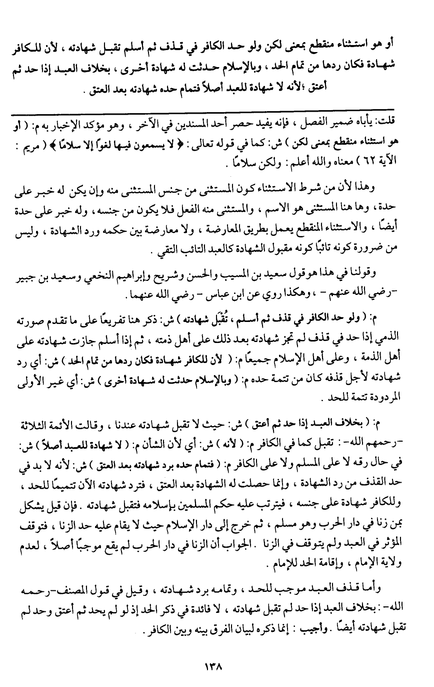 وهذا لأن من شرط الاستثناء كون المستثنى من جنس المستثنى منه وإن يكن له خبر على حدة، وها هنا المستثنى هو الاسم، والمستثنى منه الفعل فلا يكون من جنسه، وله خبر على حدة أيضاً، والاستثناء المنقطع يعمل بطريق المعارضة، ولا معارضة بين حكمه ورد الشهادة، وليس من ضرورة كونه تائباً كونه مقبول الشهادة كالعبد التائب التقي.