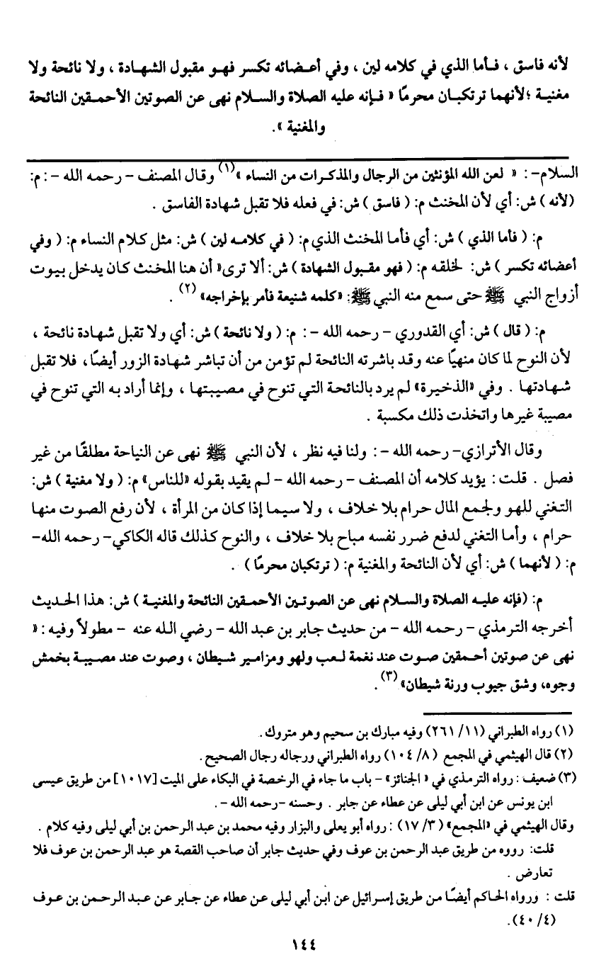 لأنه فاسق، فأما الذي في كلامه لين، وفي أعضائه تكسر فهو مقبول الشهادة، ولا نائحة ولا مغنية؛ لأنهما ترتكبان محرما «فإنه - عَلَيْهِ الصَّلَاةُ وَالسَّلَامُ - نهى عن الصوتين الأحمقين النائحة والمغنية» .