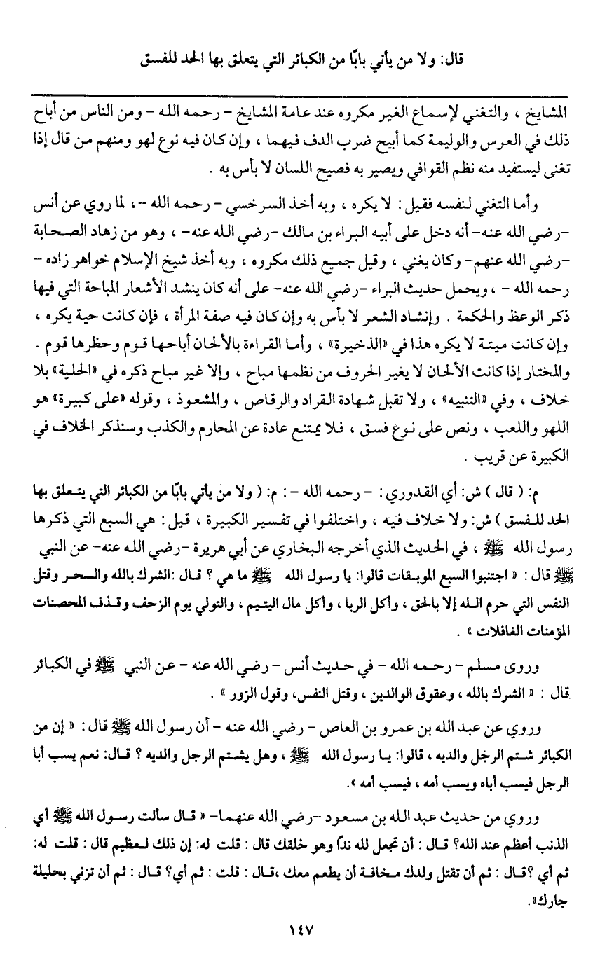 وأما التغني لنفسه فقيل: لا يكره، وبه أخذ السرخسي - رَحِمَهُ اللَّهُ -، ولما روي عن أنس - رَضِيَ اللَّهُ عَنْهُ - أنه دخل على أبيه البراء بن مالك - رَضِيَ اللَّهُ عَنْهُ -، وهو من زهاد الصحابة - رَضِيَ اللَّهُ عَنْهُمْ - وكان يغني، وقيل جميع ذلك مكروه، وبه أخذ شيخ الإسلام خواهر زاده - رَحِمَهُ اللَّهُ -، ويحمل حديث البراء - رَضِيَ اللَّهُ عَنْهُ - على أنه كان ينشد الأشعار المباحة التي فيها ذكر الوعظ والحكمة. وإنشاد الشعر لا بأس به وإن كان فيه صفة المرأة، فإن كانت حية يكره، وإن كانت ميتة لا يكره هذا في " الذخيرة "، وأما القراءة بالألحان أباحها قوم وحظرها قوم. والمختار إذا كانت الألحان لا يغير الحروف من نظمها مباح، وإلا غير مباح ذكره في " الحلية " بلا خلاف، وفي " التنبيه "، ولا تقبل شهادة القرار والرقاص، والمشعوذ، وقوله " على كبيرة " هو اللهو واللعب، ونص على نوع فسق، فلا يمنع عادة عن المحارم والكذب وسنذكر الخلاف في الكبيرة عن قريب.