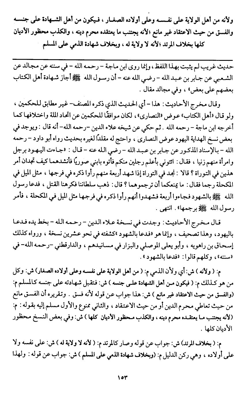 وقال مخرج الأحاديث: هذا - أي الحديث الذي ذكره المصنف - غير مطابق للحكمين، ولو قال " أهل الكتاب " عوض " النصارى "، لكان موافقاً للحكمين عن اتحاد الملة واختلافها كما أخرجه ابن ماجه - رَحِمَهُ اللَّهُ -. ثم حكي عن شيخه علاء الدين - رَحِمَهُ اللَّهُ - أنه قال: ويوجد في بعض نسخ الهداية اليهود عوض النصارى، واحتج له مقلداً لغيره بحديث رواه أبو داود - رَحِمَهُ اللَّهُ - بالإسناد المذكور عن جابر بن عبد الله - رَضِيَ اللَّهُ عَنْهُ - قال: «جاءت اليهود برجل وامرأة منهم زنيا، فقال: ائتوني بأعلم رجلين منكم فأتوه بابني صوريا فأنشدهما كيف تجدان أمر هذين في التوراة؟ قالا: نجد في التوراة إذا شهد أربعة منهم رأوا ذكره في فرجها، مثل الميل في المكحلة رجما فقال: ما يمنعكما أن ترجموهما؟ قال: ذهب سلطاننا فكرهنا القتل، فدعا رسول الله - صَلَّى اللَّهُ عَلَيْهِ وَسَلَّمَ - بالشهود فجاءوا أربعة فشهدوا أنهم رأوا ذكره في فرجها مثل الميل في المكحلة، فأمر رسول الله - صَلَّى اللَّهُ عَلَيْهِ وَسَلَّمَ - برجمهما» . انتهى.
