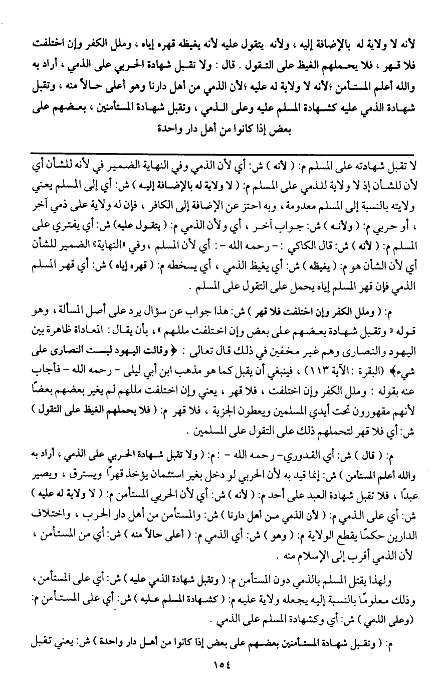 م: (قال) ش: أي القدوري - رَحِمَهُ اللَّهُ -: م: (ولا تقبل شهادة الحربي على الذمي، أراد به والله أعلم المستأمن) ش: إنما قيد به لأن الحربي لو دخل بغير استئمان يؤخذ قهراً ويسترق، ويصير عبداً، فلا تقبل شهادة العبد على أحد م: (لأنه) ش: أي لأن الحربي المستأمن م: (لا ولاية له عليه) ش: أي على الذمي م: (لأن الذمي من أهل دارنا) ش: والمستأمن من أهل دار الحرب، واختلاف الدارين حكماً يقطع الولاية م: (وهو) ش: أي الذمي م: (أعلى حالاً منه) ش: أي من المستأمن؛ لأن الذمي أقرب إلى الإسلام منه.