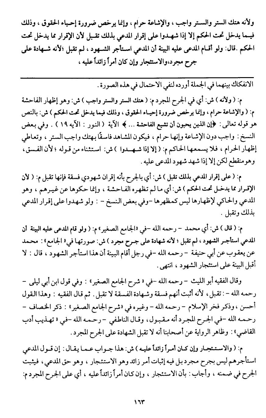 م: (ولأنه) ش: أي في الجرح المجرد م: (هتك الستر والستر واجب) ش: وهو إظهار الفاحشة م: (والإشاعة حرام، وإنما يرخص ضرورة إحياء الحقوق، وذلك فيما يدخل تحت الحكم) ش: بالنص هو قَوْله تَعَالَى: {إِنَّ الَّذِينَ يُحِبُّونَ أَنْ تَشِيعَ الْفَاحِشَةُ} [النور: 19] الآية (النور: الآية 19) . وفي بعض النسخ: واجب دون الإشاعة وإنها حرام، فيكون المشاهد فاسقاً بهتك واجب الستر، وتعاطي إظهار الحرام، فلا يسمعها الحاكم م: (إلا إذا شهدوا) ش: استثناء من قوله؛ لأن الفسق، وهو منقطع لكن إلا إذا شهد شهود المدعى عليه.