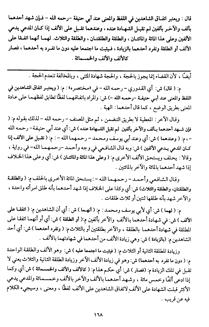 قال: ويعتبر اتفاق الشاهدين في اللفظ والمعنى عند أبي حنيفة - رَحِمَهُ اللَّهُ - فإن شهد أحدهما بألف والآخر بألفين لم تقبل الشهادة عنده، وعندهما تقبل على الألف إذا كان المدعي يدعي الألفين وعلى هذا المائة والمائتان، والطلقة والطلقتان، والطلقة والثلاث. لهما أنهما اتفقا على الألف أو الطلقة وتفرد أحدهما بالزيادة، فيثبت ما اجتمعا عليه دون ما تفرد به أحدهما، فصار كالألف والألف والخمسمائة.
