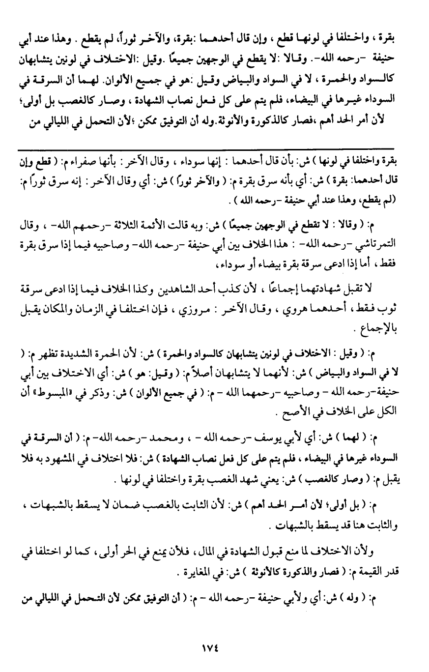 بقرة، واختلفا في لونها قطع، وإن قال أحدهما: بقرة، والآخر ثوراً، لم يقطع. وهذا عند أبي حنيفة - رحمه الله -. وقالا: لا يقطع في الوجهين جميعاً. وقيل: الاختلاف في لونين يتشابهان كالسواد والحمرة، لا في السواد والبياض وقيل: هو في جميع الألوان. لهما أن السرقة في السوداء غيرها في البيضاء، فلم يتم على كل فعل نصاب الشهادة، وصار كالغصب بل أولى؛ لأن أمر الحد أهم، فصار كالذكورة والأنوثة. وله أن التوفيق ممكن؛ لأن التحمل في الليالي من