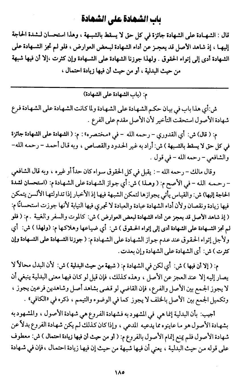 باب الشهادة على الشهادة قال: الشهادة على الشهادة جائزة في كل حق لا يسقط بالشبهة، وهذا استحسان لشدة الحاجة إليها، إذ شاهد الأصل قد يعجز عن أداء الشهادة لبعض العوارض، فلو لم تجز الشهادة على الشهادة أدى إلى إتواء الحقوق. ولهذا جوزنا الشهادة على الشهادة وإن كثرت، إلا أن فيها شبهة من حيث البدلية، أو من حيث أن فيها زيادة احتمال،