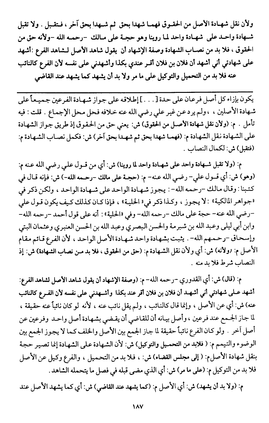 م: (ولا تقبل شهادة واحد على شهادة واحد لما روينا) ش: أي من قول علي - رَضِيَ اللَّهُ عَنْهُ - م: (وهو) ش: أي قول علي - رَضِيَ اللَّهُ عَنْهُ - م: (حجة على مالك - رَحِمَهُ اللَّهُ -) ش: فإنه قال في كتبنا: وقال مالك - رَحِمَهُ اللَّهُ -: يجوز شهادة الواحد على شهادة الواحد، ولكن ذكر في " جواهر المالكية ": لا يجوز، وكذا ذكر في " الحلية "، فإذا كان كذلك كيف يكون قول علي - رَضِيَ اللَّهُ عَنْهُ - حجة على مالك - رَحِمَهُ اللَّهُ - وفي " الحلية ": أنه على قول أحمد - رَحِمَهُ اللَّهُ - وابن أبي ليلي وعبد الله بن شبرمة والحسن البصري وعبد الله بن الحسن العنبري وعثمان البتي وإسحاق - رَحِمَهُمُ اللَّهُ -. يثبت بشهادة واحد شهادة الأصل الواحد، لأن الفرع قائم مقام الأصل م: (ولأنه) ش: أي ولأن نقل الشهادة م: (حق من الحقوق، فلا بد من نصاب الشهادة) ش: إذ النصاب شرط فلا بد منه.