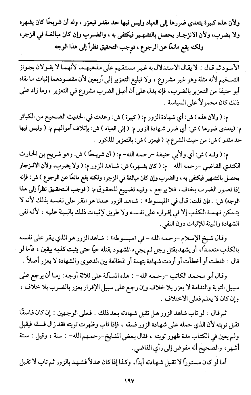 وقال شيخ الإسلام - رَحِمَهُ اللَّهُ - في " مبسوطه ": شاهد الزور هو الذي يقر على نفسه بالكذب متعمدا، أو يشهد بقتل رجل ثم يجيء المشهود بقتله حيا حتى يثبت كذبه بيقين، فأما لو قال: غلطت أو أخطأت أو أردت شهادة بتهمة أو المخالفة بين الدعوى والشهادة لا يعزر أصلا.