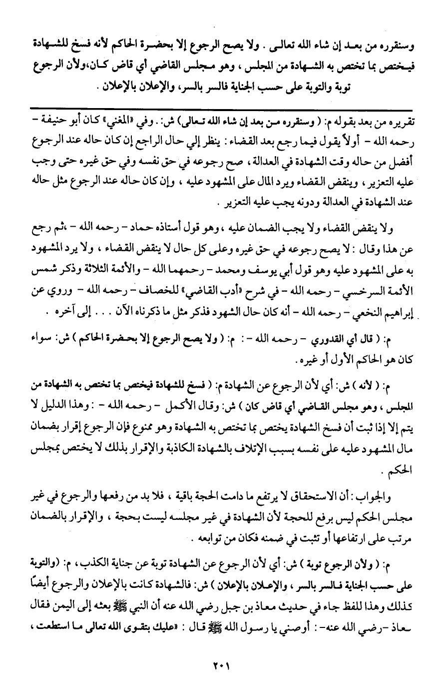 ولا يصح الرجوع إلا بحضرة الحاكم؛ لأنه فسخ للشهادة، فيختص بما تختص به الشهادة من المجلس، وهو مجلس القاضي أي قاض كان، ولأن الرجوع توبة، والتوبة على حسب الجناية، فالسر بالسر، والإعلان بالإعلان.