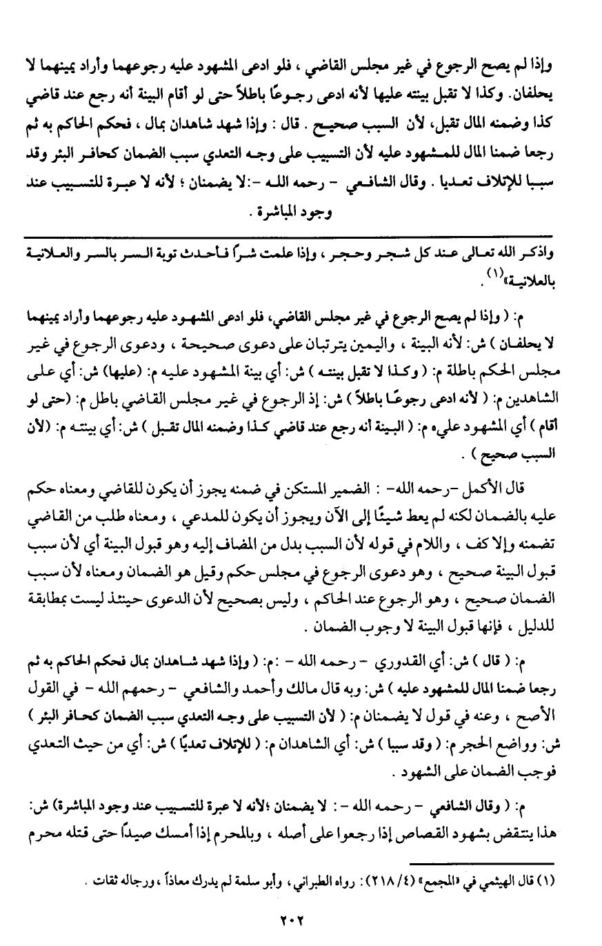 . قال: وإذا شهد شاهدان بمال، فحكم الحاكم به ثم رجعا ضمنا المال للمشهود عليه؛ لأن التسبيب على وجه التعدي سبب الضمان كحافر البئر، وقد سببا للإتلاف تعديا. وقال الشافعي - رَحِمَهُ اللَّهُ -: لا يضمنان؛ لأنه لا عبرة للتسبيب عند وجود المباشرة.