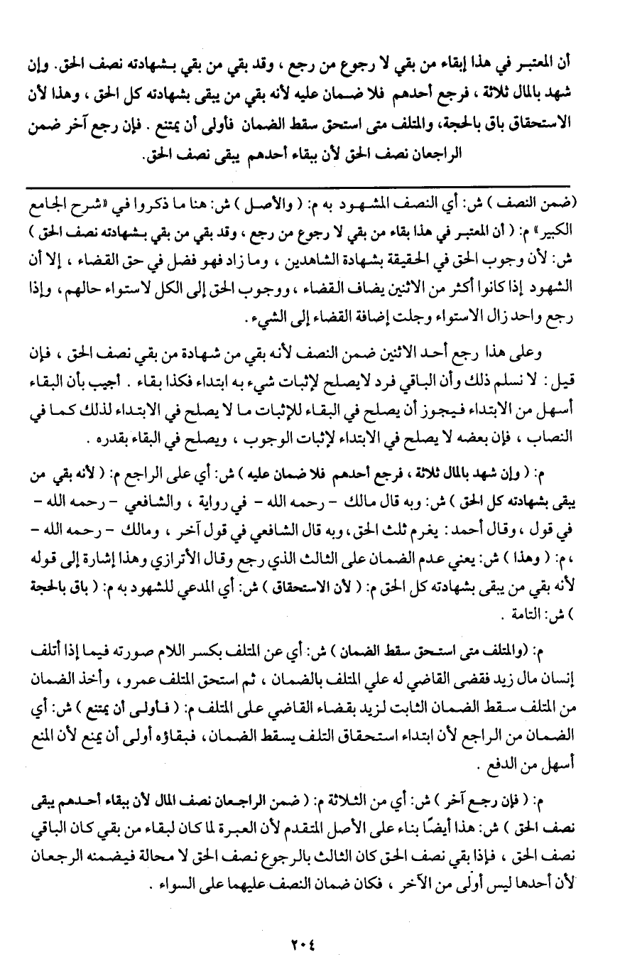 أن المعتبر في هذا إبقاء من بقي لا رجوع من رجع، وقد بقي من بقي بشهادته نصف الحق. وإن شهد بالمال ثلاثة، فرجع أحدهم فلا ضمان عليه؛ لأنه بقي من يبقى بشهادته كل الحق، وهذا لأن الاستحقاق باق بالحجة، والمتلف متى استحق سقط الضمان فأولى أن يمتنع. فإن رجع آخر ضمن الراجعان نصف الحق؛ لأن ببقاء أحدهم يبقى نصف الحق.