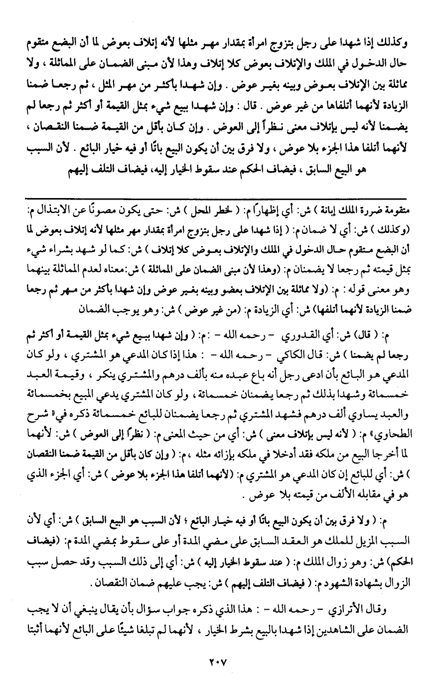 وكذلك إذا شهدا على رجل بتزوج امرأة بمقدار مهر مثلها؛ لأنه إتلاف بعوض لما أن البضع متقوم حال الدخول في الملك والإتلاف بعوض كلا إتلاف، وهذا لأن مبنى الضمان على المماثلة، ولا مماثلة بين الإتلاف بعوض وبينه بغير عوض. وإن شهدا بأكثر من مهر المثل، ثم رجعا ضمنا الزيادة؛ لأنهما أتلفاها من غير عوض. قال: وإن شهدا ببيع شيء بمثل القيمة أو أكثر ثم رجعا لم يضمنا؛ لأنه ليس بإتلاف معنى نظرا إلى العوض. وإن كان بأقل من القيمة ضمنا النقصان؛ لأنهما أتلفا هذا الجزء بلا عوض، ولا فرق بين أن يكون البيع باتا أو فيه خيار البائع. لأن السبب هو البيع السابق، فيضاف الحكم عند سقوط الخيار إليه، فيضاف التلف إليهم
