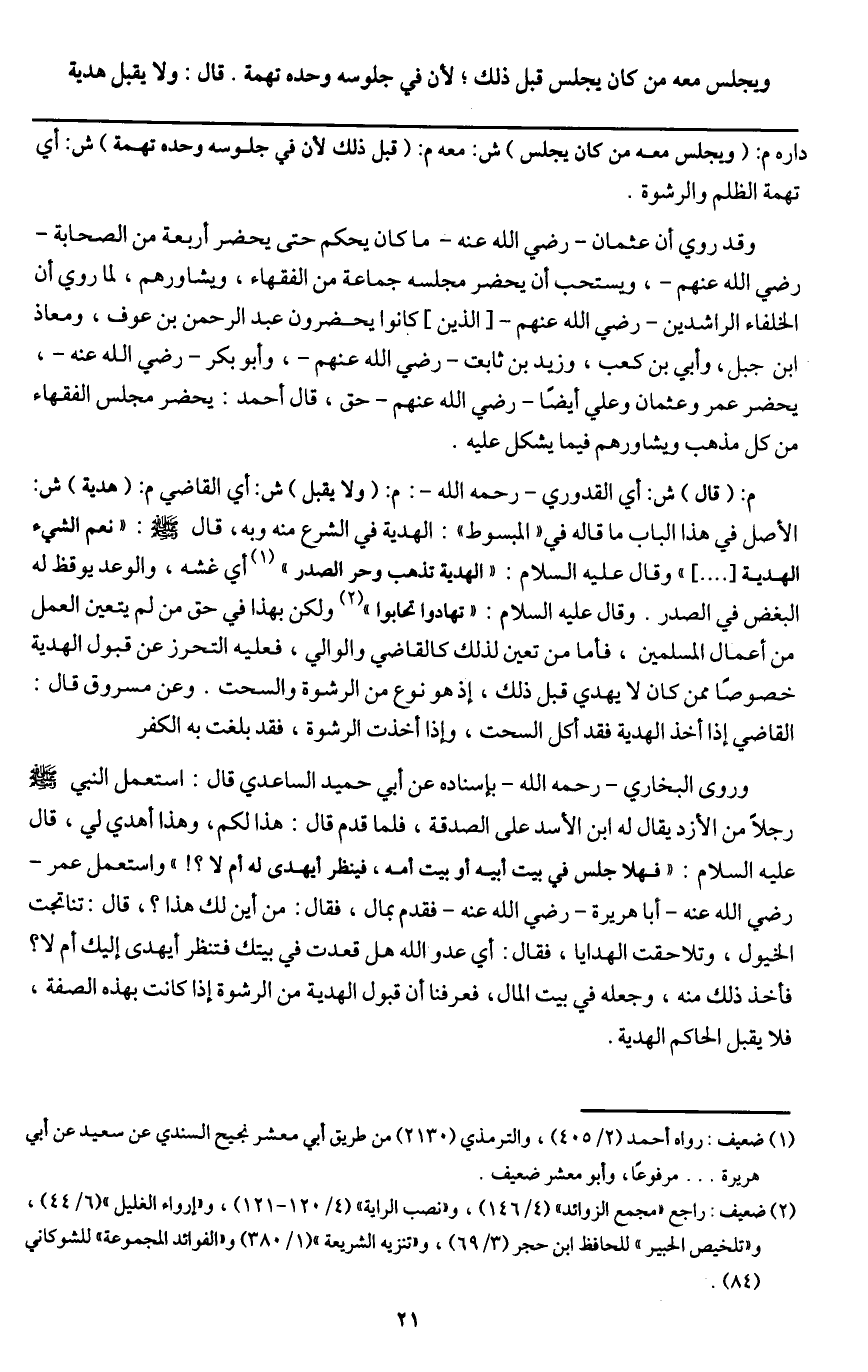 وروى البخاري - رَحِمَهُ اللَّهُ - بإسناده عن أبي حميد الساعدي قال: «استعمل النبي - صَلَّى اللَّهُ عَلَيْهِ وَسَلَّمَ - رجلا من الأزد يقال له ابن الأسد على الصدقة، فلما قدم قال: هذا لكم، وهذا أهدي لي، قال - عَلَيْهِ السَّلَامُ -: "فهلا جلس في بيت أبيه أو بيت أمه، فينظر أيهدى له أم لا؟!» واستعمل عمر - رَضِيَ اللَّهُ عَنْهُ - أبا هريرة - رَضِيَ اللَّهُ عَنْهُ - فقدم بمال، فقال: من أين لك هذا؟، قال: تناتجت الخيول، وتلاحقت الهدايا، فقال: أي عدو الله هل قعدت في بيتك فتنظر أيهدى إليك أم لا؟ فأخذ ذلك منه، وجعله في بيت المال، فعرفنا أن قبول الهدية من الرشوة إذا كانت بهذه الصفة، فلا يقبل الحاكم الهدية.