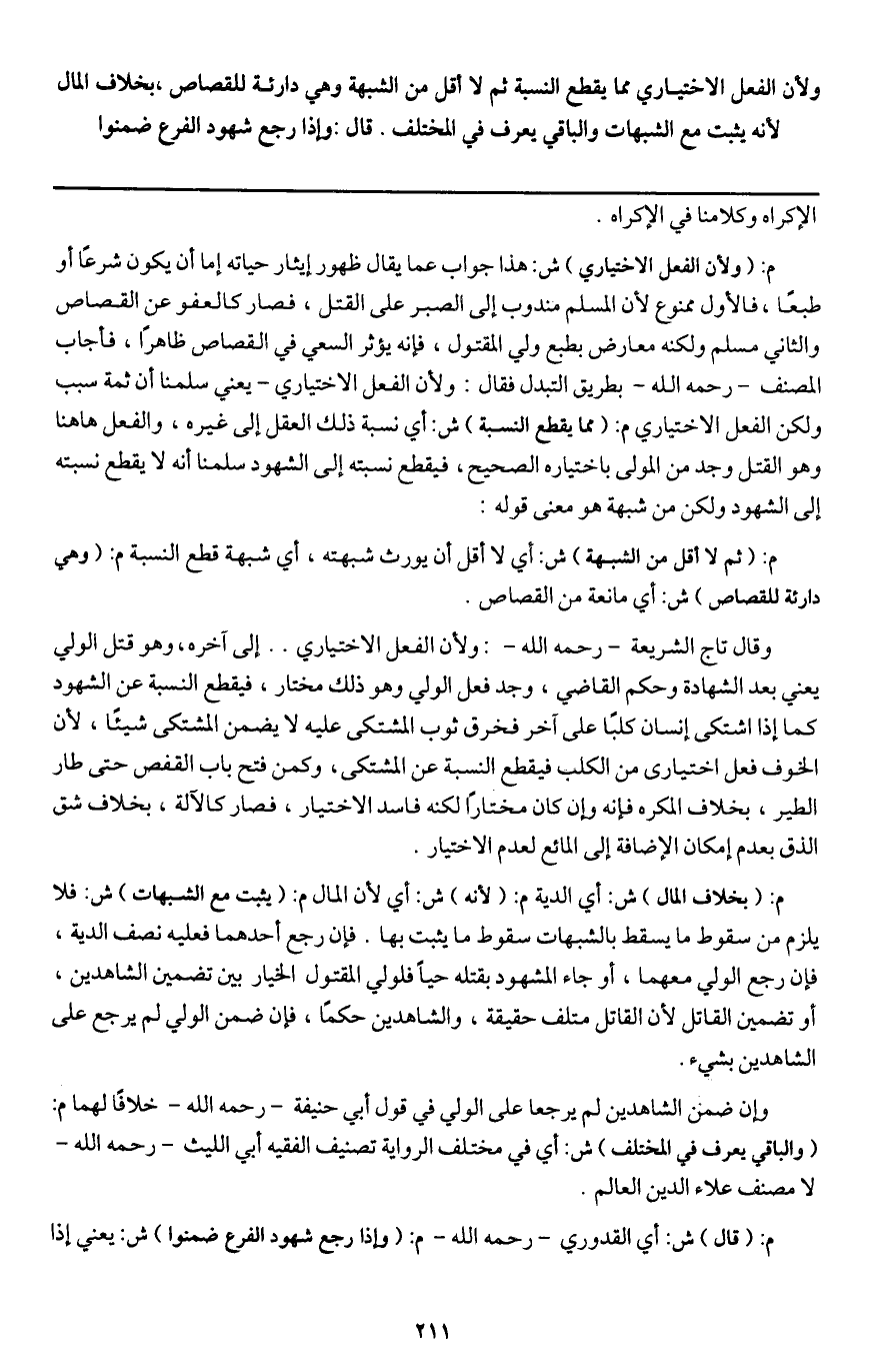 وقال تاج الشريعة - رَحِمَهُ اللَّهُ -: ولأن الفعل الاختياري..... إلى آخره، وهو قتل الولي يعني بعد الشهادة وحكم القاضي، وجد فعل الولي وهو ذلك مختار، فيقطع النسبة عن الشهود، كما إذا اشتكى إنسان كلبا على آخر فخرق ثوب المشتكى عليه لا يضمن المشتكى شيئا؛ لأن الخوف فعل اختياري من الكلب فيقطع النسبة عن المشتكى، وكمن فتح باب القفص حتى طار الطير، بخلاف المكره، فإنه وإن كان مختارا لكنه فاسد الاختيار، فصار كالآلة، بخلاف شق الذق بعدم إمكان الإضافة إلى المائع لعدم الاختيار.