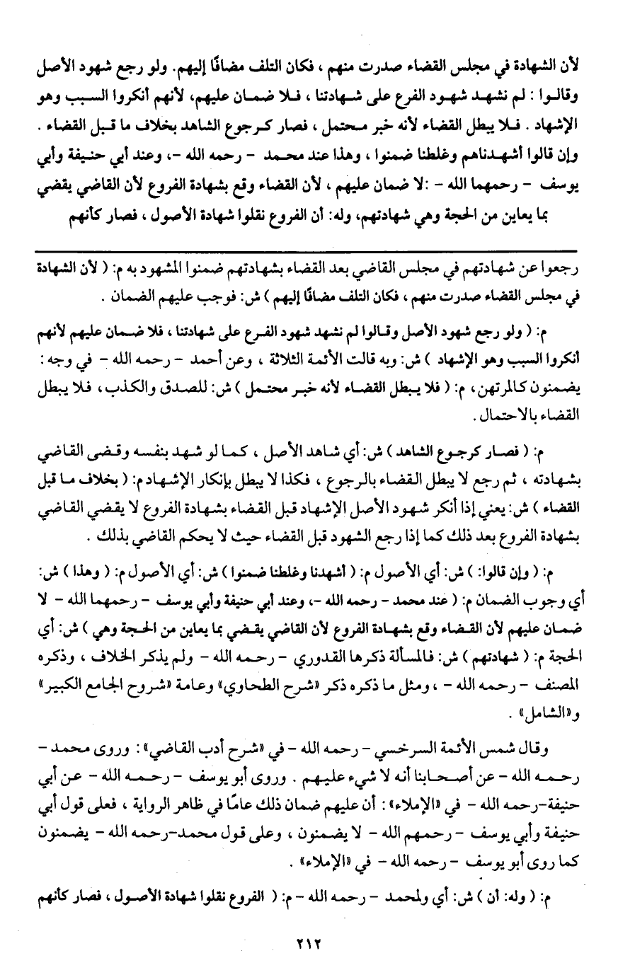 لأن الشهادة في مجلس القضاء صدرت منهم، فكان التلف مضافا إليهم. ولو رجع شهود الأصل وقالوا: لم نشهد شهود الفرع على شهادتنا، فلا ضمان عليهم؛ لأنهم أنكروا السبب وهو الإشهاد. فلا يبطل القضاء لأنه خبر محتمل، فصار كرجوع الشاهد بخلاف ما قبل القضاء. وإن قالوا: أشهدناهم وغلطنا ضمنوا، وهذا عند محمد - رَحِمَهُ اللَّهُ -، وعند أبي حنيفة وأبي يوسف - رحمهما الله -: لا ضمان عليهم؛ لأن القضاء وقع بشهادة الفروع؛ لأن القاضي يقضي بما يعاين من الحجة وهي شهادتهم، وله: أن الفروع نقلوا شهادة الأصول، فصار كأنهم