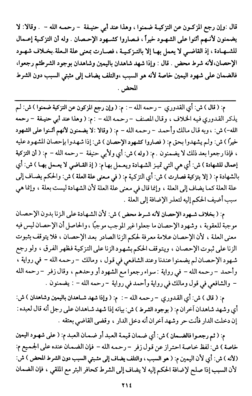 قال: وإن رجع المزكون عن التزكية ضمنوا، وهذا عند أبي حنيفة - رَحِمَهُ اللَّهُ -. وقالا: لا يضمنون لأنهم أثنوا على الشهود خيرا، فصاروا كشهود الإحصان. وله أن التزكية إعمال للشهادة، إذ القاضي لا يعمل بها إلا بالتزكية، فصارت بمعنى علة العلة. بخلاف شهود الإحصان؛ لأنه شرط محض.