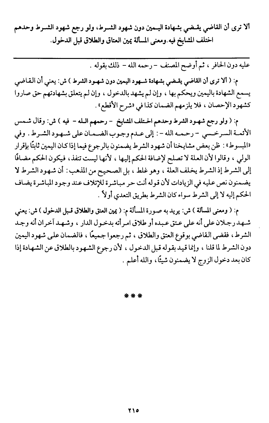 ألا ترى أن القاضي يقضي بشهادة اليمين دون شهود الشرط، ولو رجع شهود الشرط وحدهم اختلف المشايخ فيه. ومعنى المسألة يمين العتاق والطلاق قبل الدخول.
