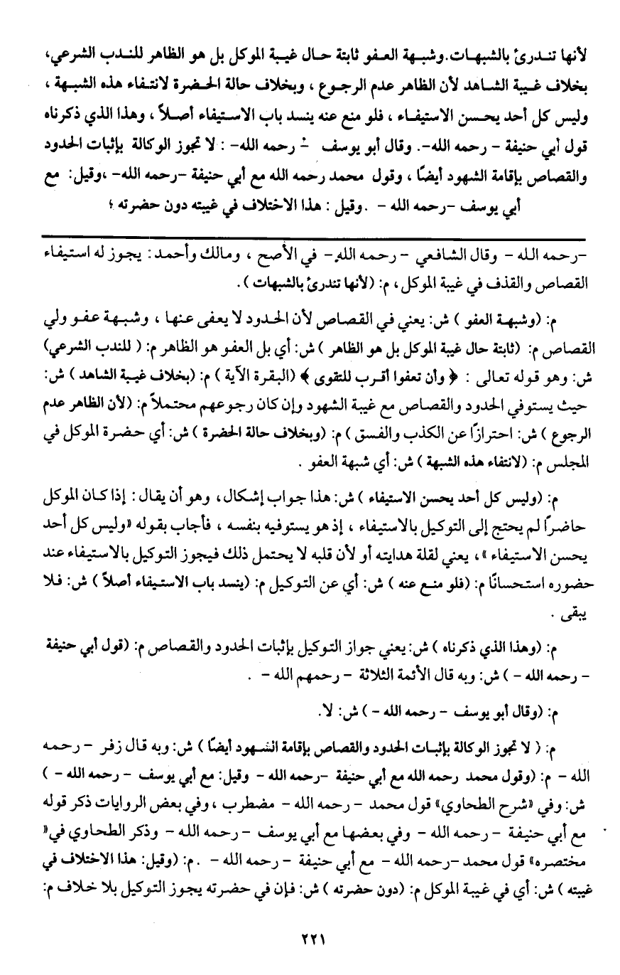 ـــــــــــــــــــــــــــــQ- رَحِمَهُ اللَّهُ - وقال الشافعي - رَحِمَهُ اللَّهُ - في الأصح، ومالك وأحمد: يجوز له استيفاء القصاص والقذف في غيبة الموكل، م: (لأنها تندرئ بالشبهات) .