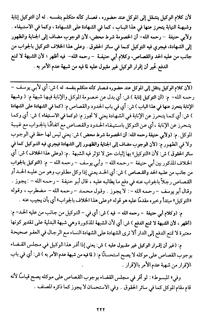 لأن كلام الوكيل ينتقل إلى الموكل عند حضوره، فصار كأنه متكلم بنفسه. له أن التوكيل إنابة وشبهة النيابة يتحرز عنها في هذا الباب، كما في الشهادة على الشهادة، وكما في الاستيفاء. ولأبي حنيفة - رَحِمَهُ اللَّهُ - أن الخصومة شرط محض؛ لأن الوجوب مضاف إلى الجناية والظهور إلى الشهادة، فيجري فيه التوكيل كما في سائر الحقوق. وعلى هذا الخلاف التوكيل بالجواب من جانب من عليه الحد والقصاص، وكلام أبي حنيفة - رَحِمَهُ اللَّهُ - فيه أظهر؛ لأن الشبهة لا تمنع الدفع غير أن إقرار الوكيل غير مقبول عليه لما فيه من شبهة عدم الأمر به.