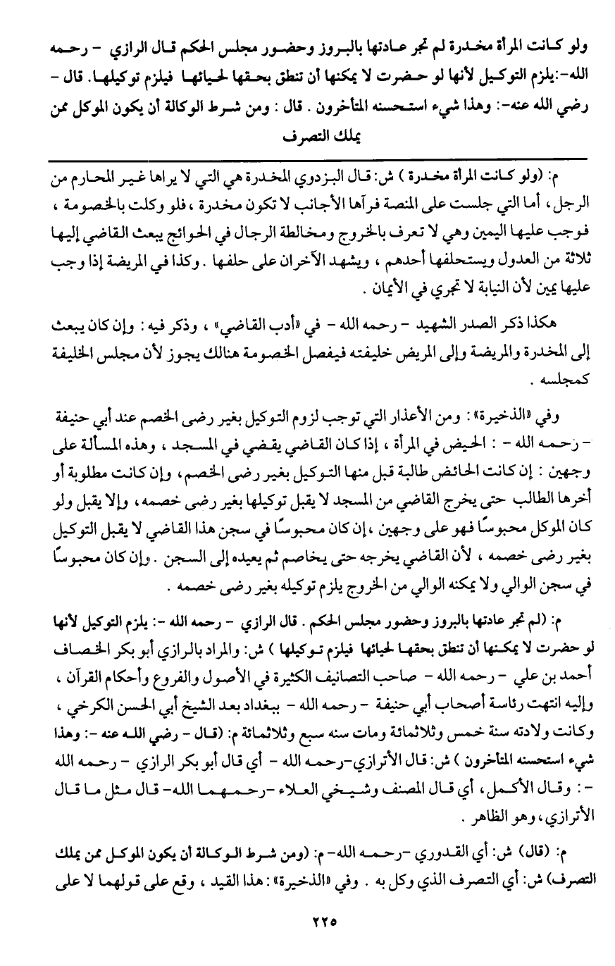 م: (لم تجر عادتها بالبروز وحضور مجلس الحكم. قال الرازي - رَحِمَهُ اللَّهُ - يلزم التوكيل؛ لأنها لو حضرت لا يمكنها أن تنطق بحقها لحيائها فيلزم توكيلها) ش: والمراد بالرازي أبو بكر الخصاف أحمد بن علي - رَحِمَهُ اللَّهُ - صاحب التصانيف الكثيرة في الأصول والفروع وأحكام القرآن، وإليه انتهت رئاسة أصحاب أبي حنيفة - رَحِمَهُ اللَّهُ - ببغداد بعد الشيخ أبي الحسن الكرخي، وكانت ولادته سنة خمس وثلاثمائة ومات سنة سبع وثلاثمائة م: (قال - رَضِيَ اللَّهُ عَنْهُ - وهذا شيء استحسنه المتأخرون) ش: قال الأترازي - رَحِمَهُ اللَّهُ - أي قال أبو بكر الرازي - رَحِمَهُ اللَّهُ -: وقال الأكمل، أي قال المصنف وشيخي العلاء - رحمهما الله - قال مثل ما قال الأترازي، وهو الظاهر.