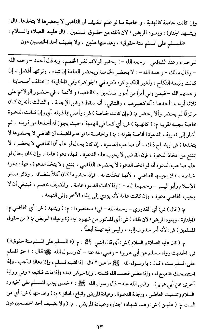 وإن كانت خاصة كالهدية. والخاصة ما لو علم المضيف أن القاضي لا يحضرها لا يتخذها. قال: ويشهد الجنازة، ويعود المريض؛ لأن ذلك من حقوق المسلمين. قال - عَلَيْهِ الصَّلَاةُ وَالسَّلَامُ -: «للمسلم على المسلم ستة حقوق» ، وعد منها هذين، ولا يضيف أحد الخصمين دون
