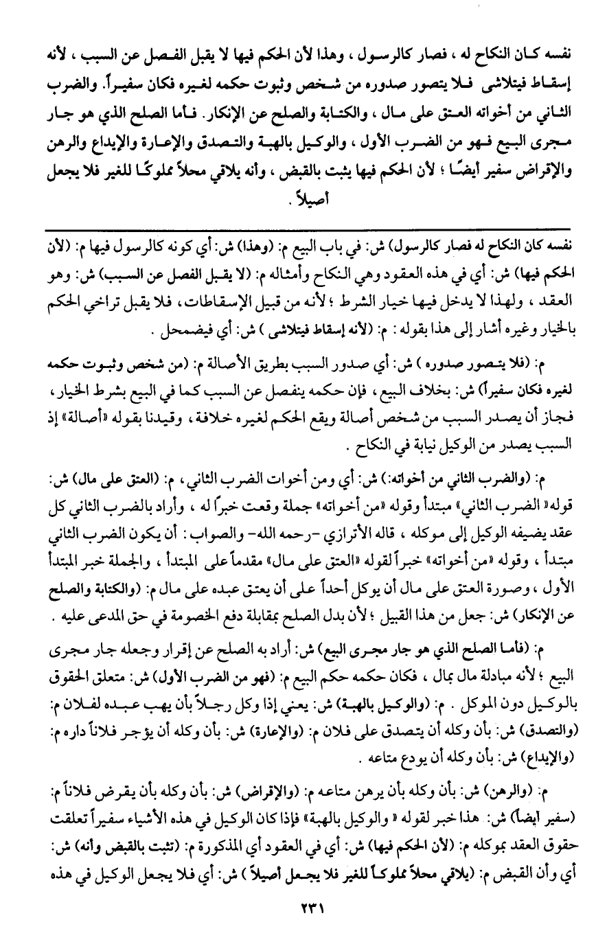 والضرب الثاني من أخواته العتق على مال، والكتابة والصلح عن الإنكار. فأما الصلح الذي هو جار مجرى البيع فهو من الضرب الأول، والوكيل بالهبة والتصدق والإعارة والإيداع والرهن والإقراض سفير أيضا؛ لأن الحكم فيها يثبت بالقبض، وأنه يلاقي محلا مملوكا للغير فلا يجعل أصيلا.