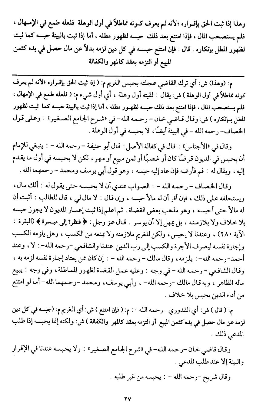 م: (قال) ش: أي القدوري - رَحِمَهُ اللَّهُ -: م: (فإن امتنع) ش: أي الغريم م: (حبسه في كل دين لزمه عن مال حصل في يده كثمن المبيع أو التزمه بعقد كالمهر والكفالة) ش: ولكنه إنما يحبسه إذا طلب المدعي ذلك.