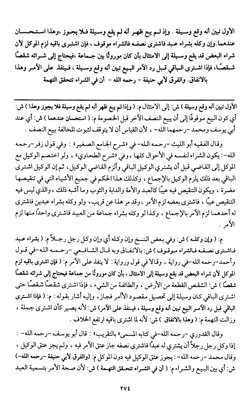 الأول تبين أنه وقع وسيلة. وإذ لم يبع ظهر أنه لم يقع وسيلة فلا يجوز، وهذا استحسان عندهما، وإن وكله بشراء عبد فاشترى نصفه فالشراء موقوف، فإن اشترى باقيه لزم الموكل لأن شراء البعض قد يقع وسيلة إلى الامتثال بأن كان موروثا بين جماعة، فيحتاج إلى شرائه شقصا شقصا، فإذا اشترى الباقي قبل رد الآمر البيع تبين أنه وقع وسيلة، فينفذ على الآمر وهذا بالاتفاق. والفرق لأبي حنيفة - رَحِمَهُ اللَّهُ - أن في الشراء تتحقق التهمة